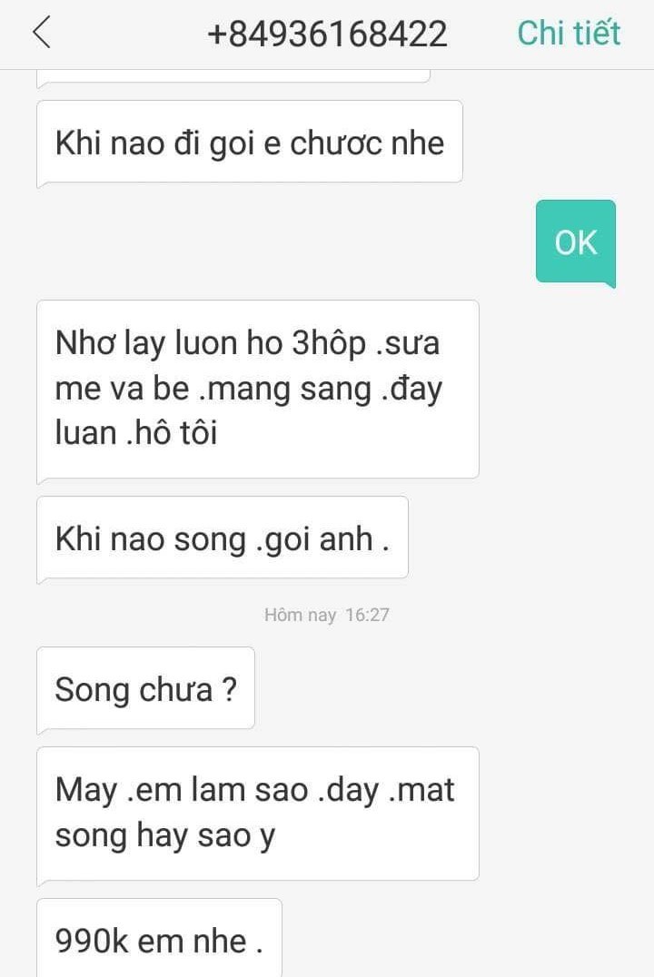 Ít phút sau, có một người đàn ông đi xe máy (xe số) đến quán và giao 3 hộp sữa được bọc kín trong một túi đen. Lúc nhận hàng, chị cẩn thận quan sát và kiểm tra bên ngoài thì thấy bên trong đúng là 3 hộp sữa, nên đã thanh toán hộ vị khách 990 nghìn. “Em đang lên xe để đi ship hàng thì người đó gọi điện bảo “không phải ship nữa, tí anh qua quán lấy”. Cuối cùng, tôi đợi mãi, đợi mãi chẳng thấy anh ta đâu. Lúc đó tôi mới chợt tỉnh ra minh bị lừa, gọi điện lại thì thấy số điện thoại anh ta liên hệ đã mất tín hiệu”, chị N. kể lại.