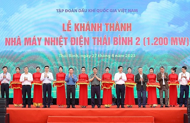 Thủ tướng Phạm Minh Chính và các đại biểu cắt băng khánh thành Nhà máy Nhiệt điện Thái Bình 2 - Ảnh: VGP/Nhật Bắc