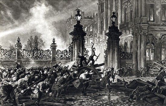 | Lực lượng cách mạng Nga đang tiến công vào Cung điện Mùa Đông ở Pêtơrôgrát trong Cách mạng tháng Mười Nga (ảnh tư liệu) |