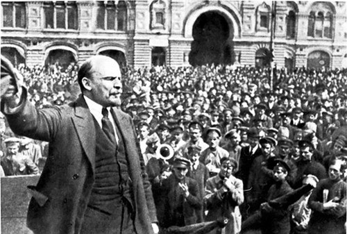 | Lênin diễn thuyết trước các chiến sĩ cách mạng Hồng vệ binh tại Quảng trường đỏ Mátxcơva trong Cách mạng tháng Mười Nga (ảnh tư liệu) |
