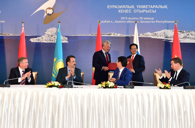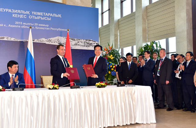 Vào tối 29/5 theo giờ địa phương, Thủ tướng Nguyễn Tấn Dũng cùng với Thủ tướng của các nước thành viên Liên minh Kinh tế Á - Âu gồm Thủ tướng Liên bang Nga Dmitry Medevedev, Thủ tướng Cộng hòa Belarus Andrei Kobyakov, Thủ tướng Cộng hòa Kazakhstan Karim Maximov, Thủ tướng Cộng hòa Armenia Hovik Abrahamyan; Thủ tướng Cộng hòa Kyrgyzstan Temir Sariyev và Chủ tịch Ban Thường trực Ủy ban Kinh tế Á - Âu Viktor Khristenko đã cùng ký Hiệp định lịch sử này nhân cuộc họp của Hội đồng liên Chính phủ của Liên minh Kinh tế Á - Âu ở cấp Thủ tướng tại tỉnh Burabai, Kazakhstan.