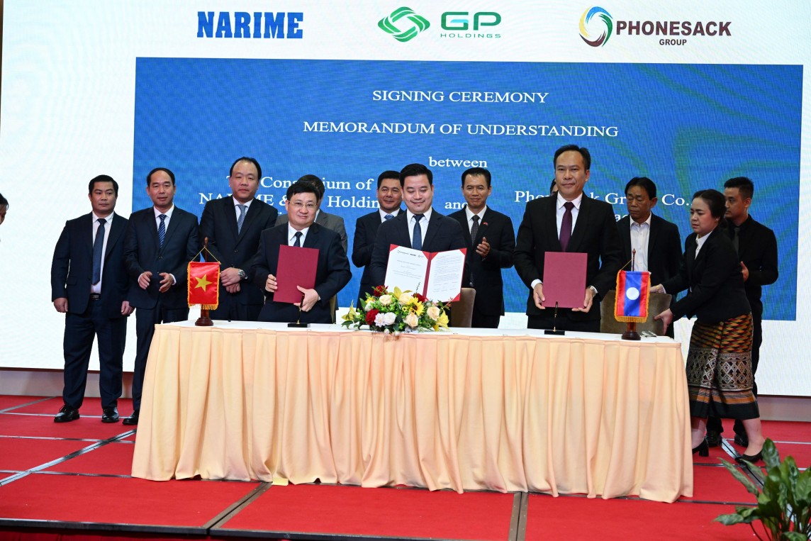 | Bộ trưởng Nguyễn Hồng Diên cùng Bộ trưởng Malaithong Kommasith chứng kiến lễ ký Biên bản ghi nhớ hợp tác giữa GP Holdings, Viện Nghiên cứu cơ khí và Tập đoàn Phonesack Group về hợp tác xây dựng kho bãi và băng truyền tải than |