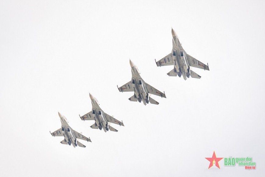 Biên đội máy bay chiến đấu Su-30MK2 bay biểu diễn ở độ cao thấp. Ảnh: QĐND