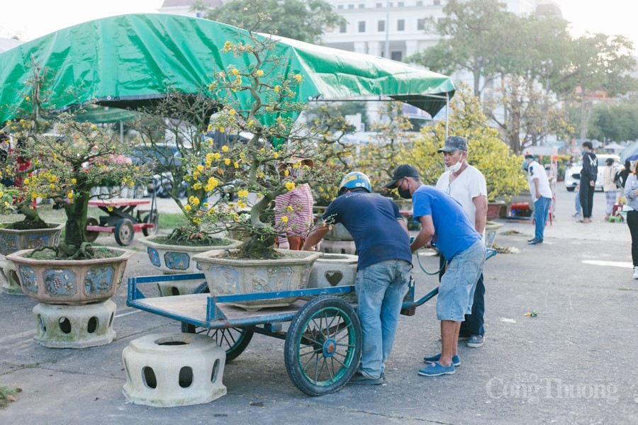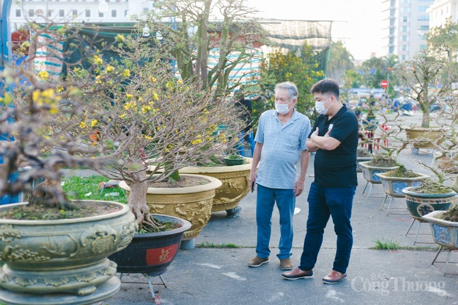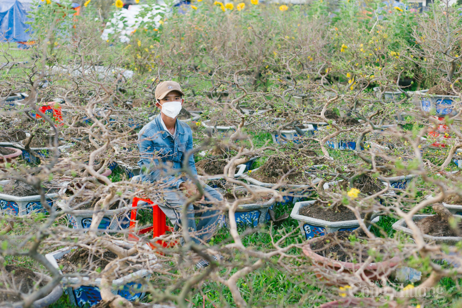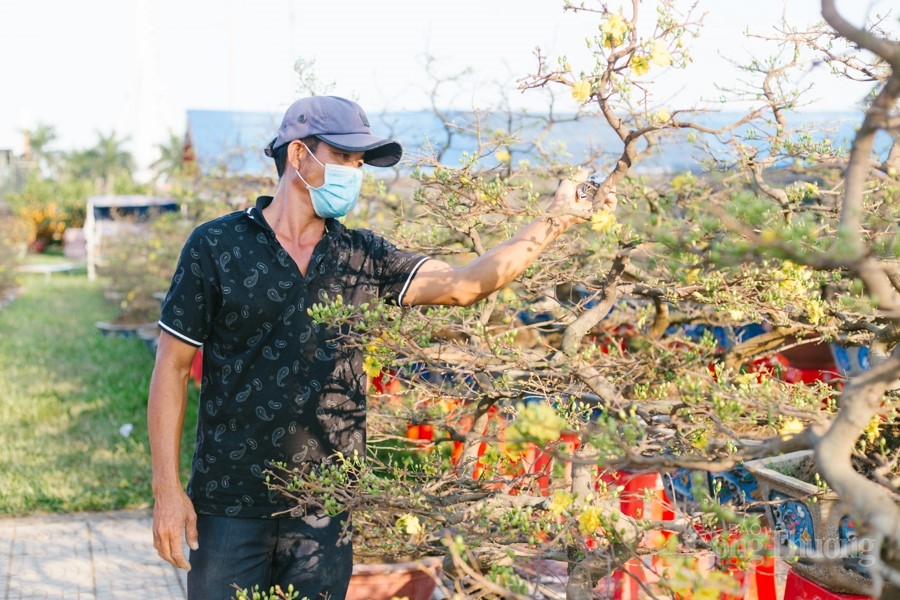 | Anh Lê Huy (39 tuổi, thị xã An Nhơn, tỉnh Bình Định) vận chuyển hơn 120 chậu mai từ Bình Định ra bán tại chợ hoa Tết Đà Nẵng. Thế nhưng 3 ngày trôi qua, anh mới bán được vỏn vẹn 3 chậu. Anh Huy chia sẻ “Năm nay biết là dịch bệnh khó khăn nên tôi đã giảm số lượng hoa mang ra chợ, song lượng khách rất vắng, bán rất chậm. Người dân đến chỉ nhìn, trả giá rồi đi. Mong sao những ngày tiếp theo bán được để thu hồi lại vốn”. |