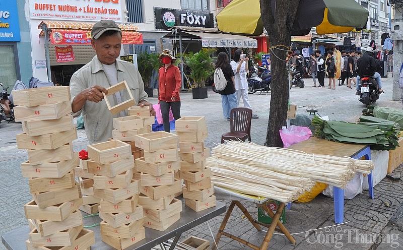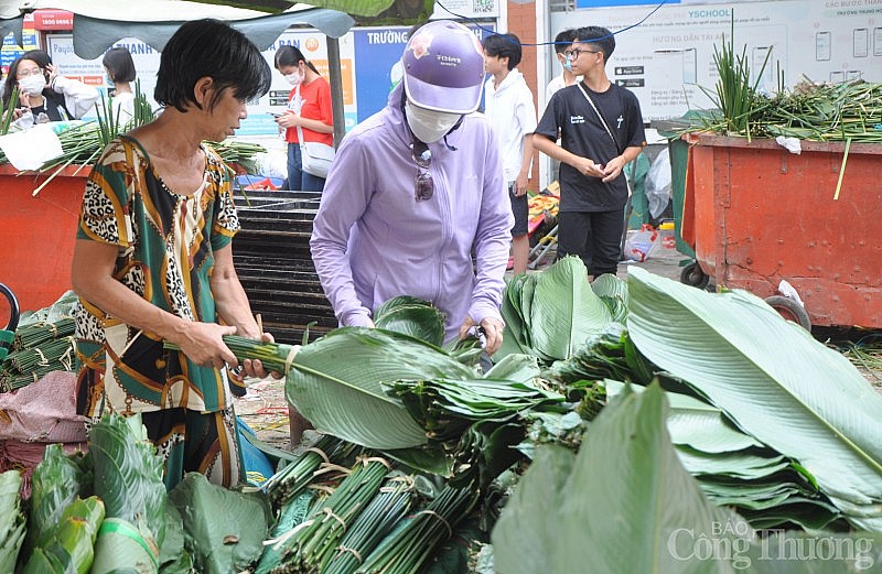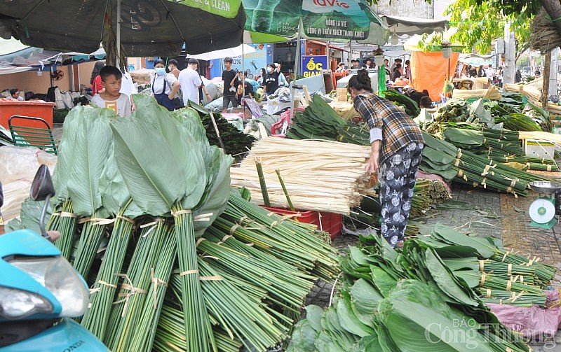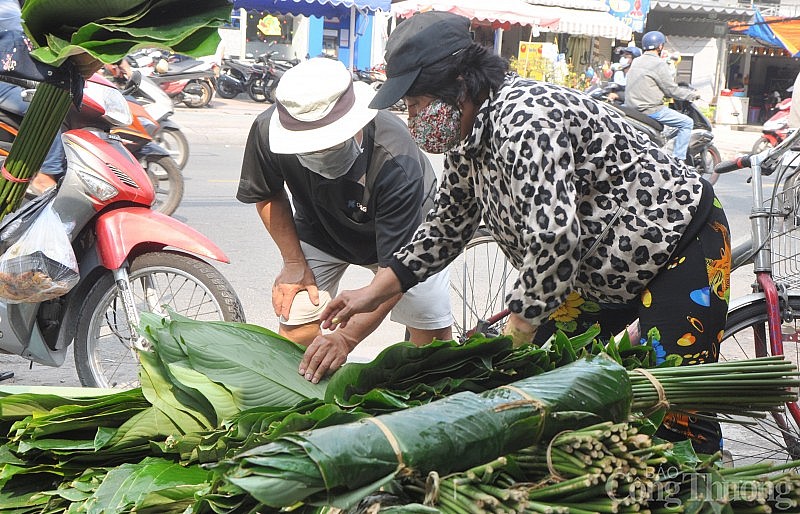 Theo ghi nhận của phóng viên Báo Công Thương ngày 17/1 (ngày 26 Tết), trên vỉa hè tại khu vực Ngã ba Ông Tạ dài hàng trăm mét khá đông người mua, người bán. Tiểu thương đã tập kết hàng từ những ngày trước, bày bán các loại lá dong, lá chuối, dây lạt, khuôn bánh chưng và đủ tất cả các vật dụng để có thể gói các loại bánh chưng, bánh tét...