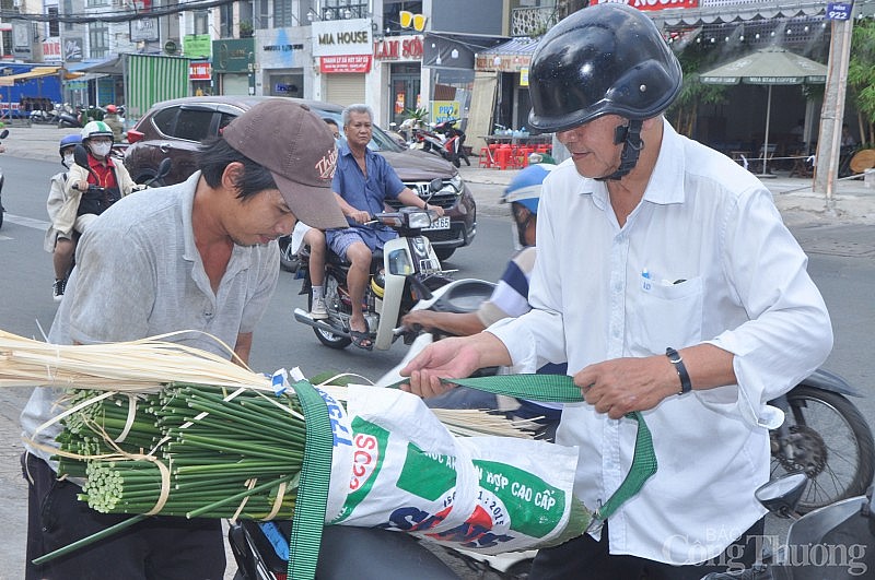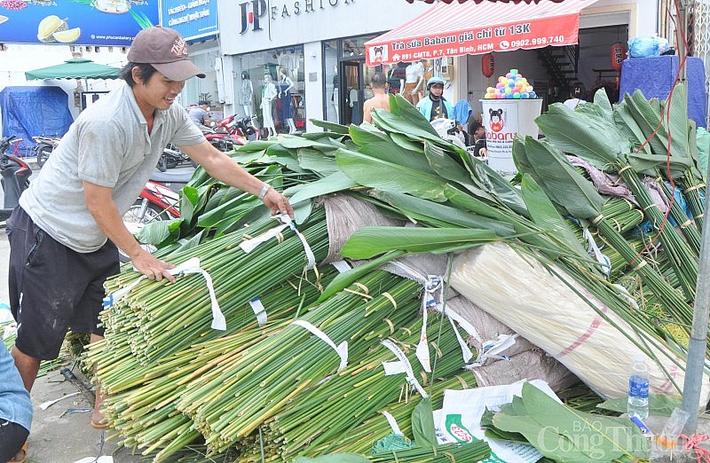 | Cùng với bán lá dong, khuôn gói bánh chứng có giá bán dao động từ 20-40.000 đồng tùy kích thước cũng được bày bán trên đường Cách Mạng Tháng Tám, quận Tân Bình |