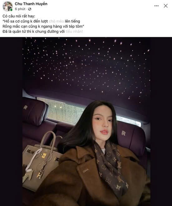Không dừng lại ở đó, sau lùm xùm về quảng cáo, Chu Thanh Huyền tiếp tục gây bão mạng với dòng trạng thái: "Hổ sa cơ cũng không đến lượt chó mèo lên tiếng. Rồng mắc cạn cũng không ngang hàng với tép tôm. Đã là quân tử thì không chung đường với tiểu nhân." Dù không nhắm trực tiếp vào ai, nhưng phát ngôn này được cho là ám chỉ những người chỉ trích cô, thể hiện thái độ coi thường và thiếu tôn trọng. Ngay lập tức, cô nhận về làn sóng phản ứng tiêu cực từ cộng đồng mạng, buộc phải xóa bài đăng.