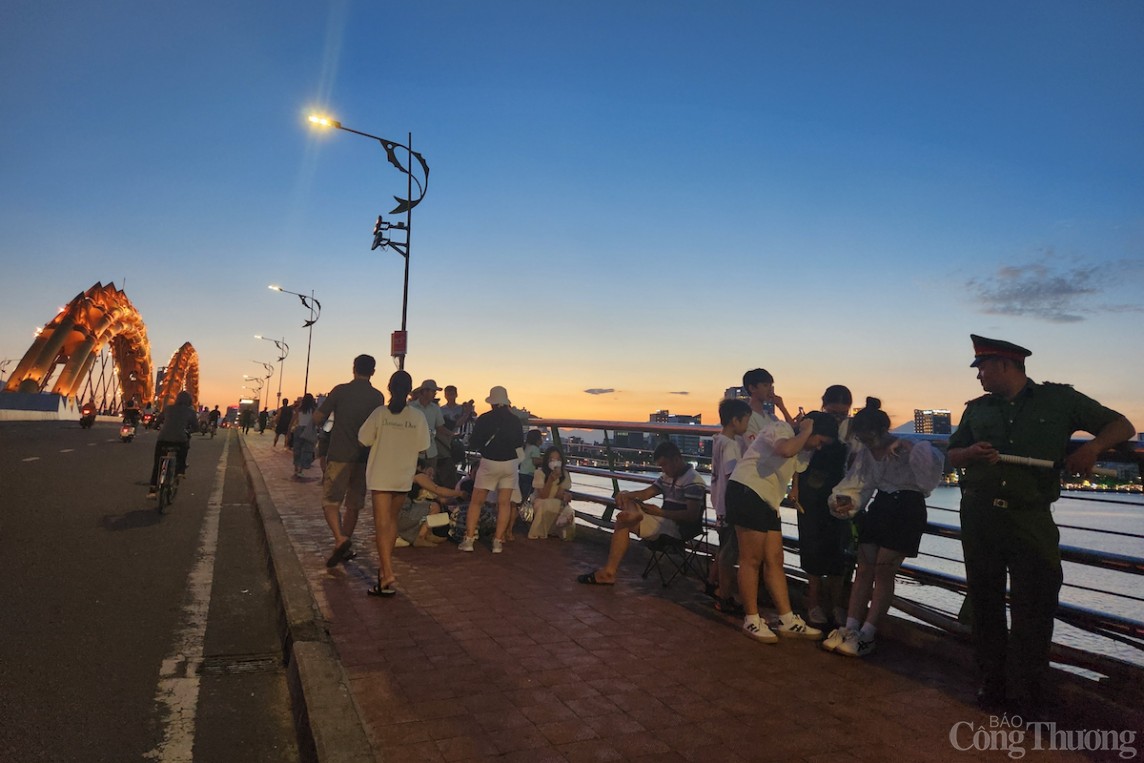 Trên cầu Rồng, ngay từ 18h tối đã rất đông người dân, du khách chờ sẵn để xem pháo hoa. |