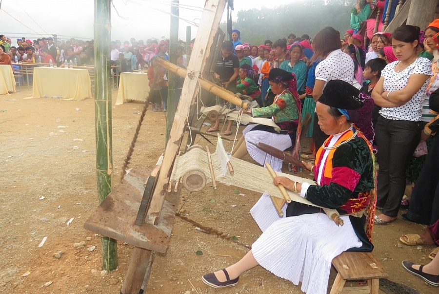 Dệt vải lanh truyền thống của dân tộc Mông được tái hiện tại phiên chợ