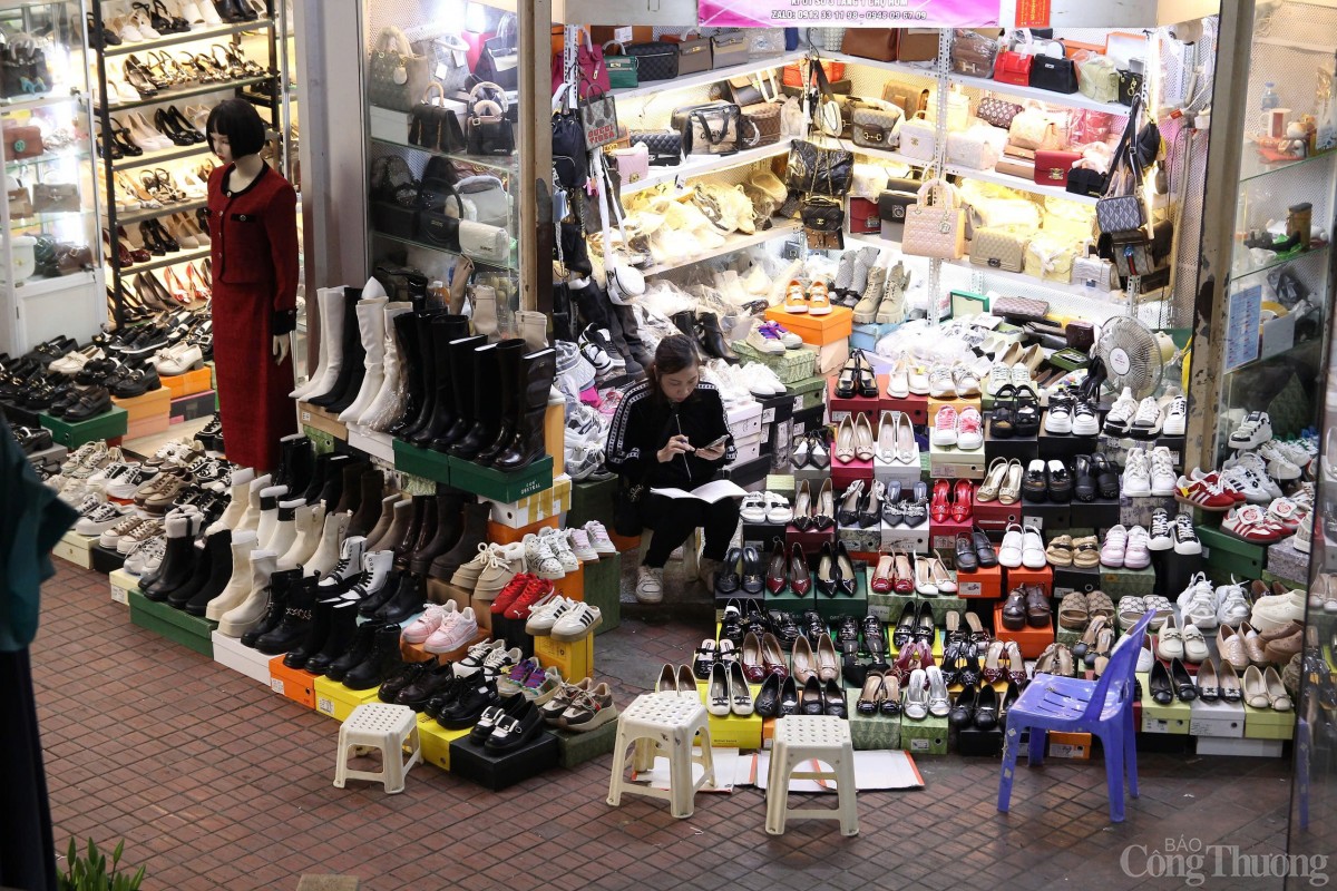 | Các sạp hàng bán giày dép tại chợ Mơ cũng chung tình trạng vắng khách. |