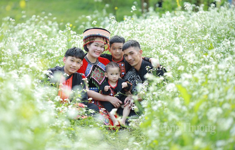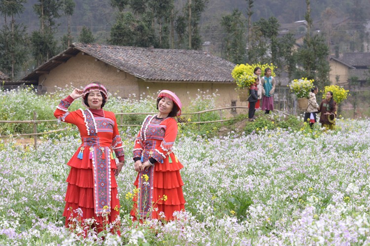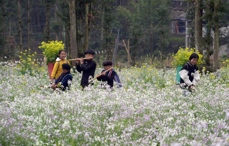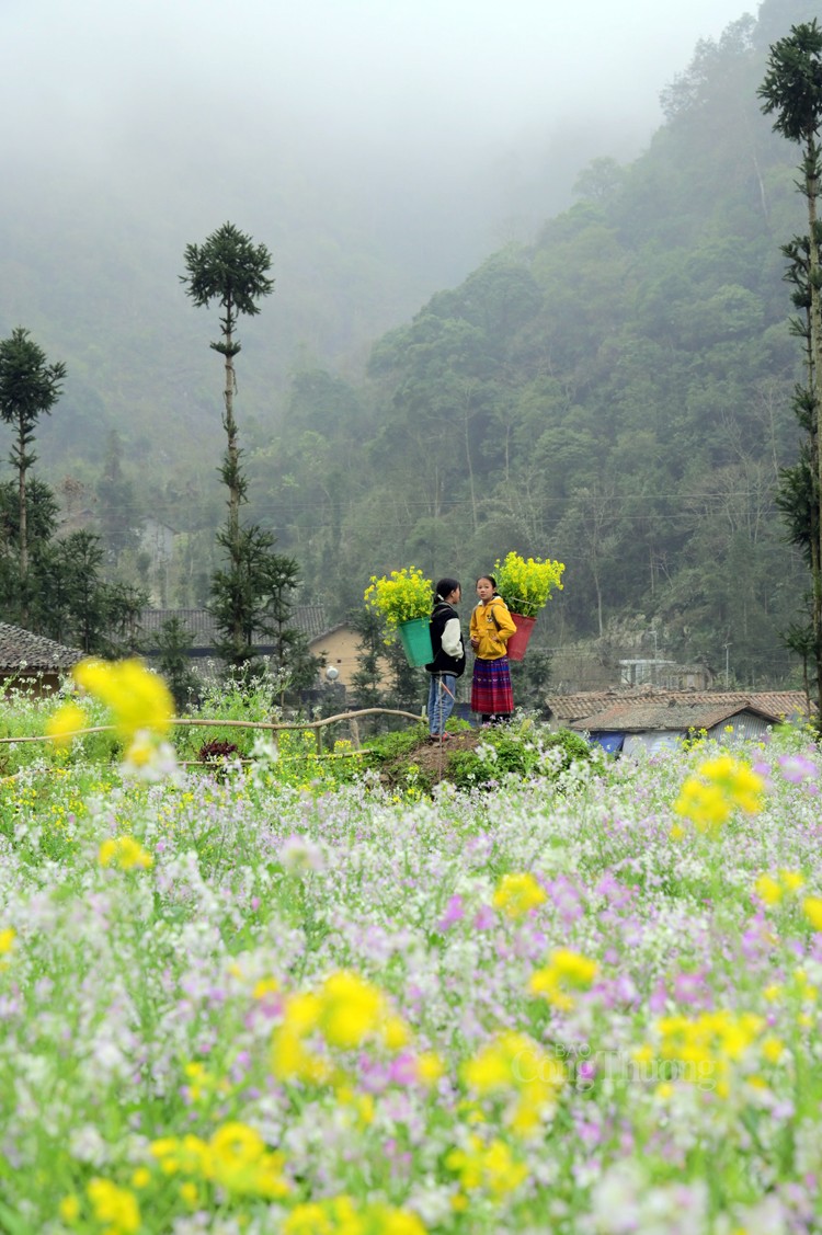 Trong khu vườn dựng hàng rào đá, những bông hoa cải khiêm nhường thấp thoáng sau những ngôi nhà trình tường bằng đất càng tôn thêm vẻ đẹp mộc mạc, giản dị nơi sơn cước. Hoa cải thường nở rộ vào tháng Ba sau Tết, cùng với hoa mận, hoa đào tạo thành một bức tranh đa sắc. Vẻ đẹp của hoa cải không nằm ở sự kiêu sa, quý phái nhưng cũng đủ rực rỡ, huy hoàng bởi màu trắng tinh khôi và màu vàng tươi sáng.