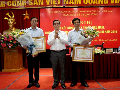 Trưởng Ban Kinh tế Trung ương Nguyễn Văn Bình (giữa) thay mặt Lãnh đạo Đảng và Nhà nước trao Bằng khen của Thủ tướng Chính phủ cho hai đồng chí Vụ trưởng |