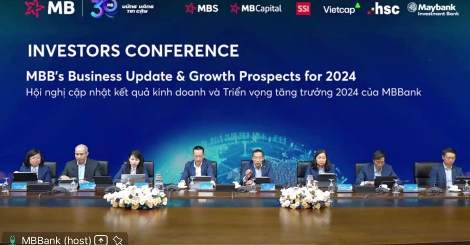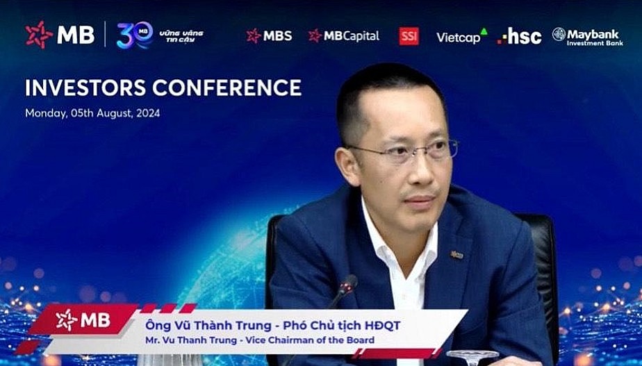Ngày 05/8, Ngân hàng TMCP Quân đội (MB, mã chứng khoán MBB) tổ chức Hội nghị nhà đầu tư (Investors Conference) nhằm cập nhật kết quả kinh doanh và triển vọng tăng trưởng năm 2024 của MB. Ông Lưu Trung Thái, Chủ tịch Hội đồng quản trị (HĐQT) chủ trì hội nghị.