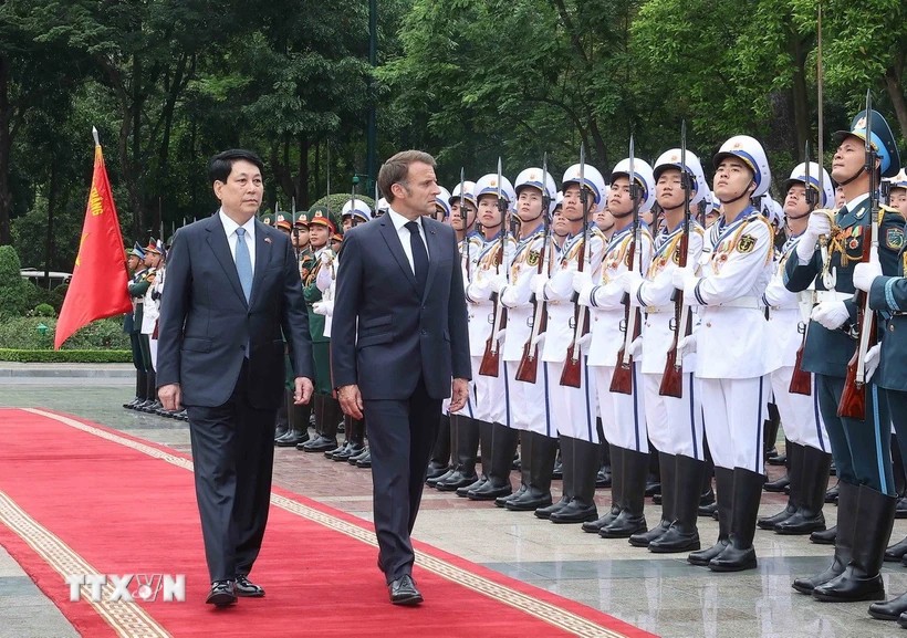 | Chủ tịch nước Lương Cường và Tổng thống Pháp Emmanuel Macron duyệt Đội danh dự Quân đội Nhân dân Việt Nam. (Ảnh: Lâm Khánh/TTXVN) |