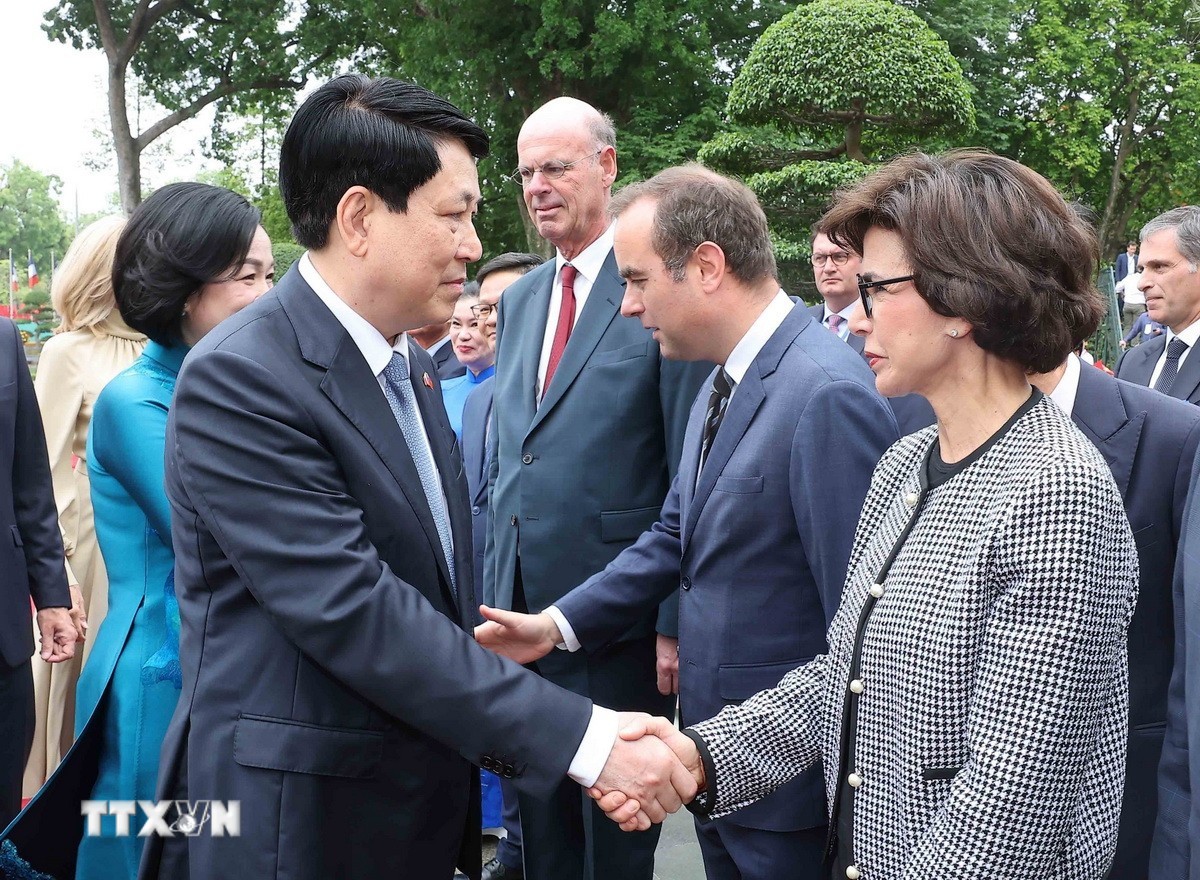 | Chủ tịch nước Lương Cường và Phu nhân với các thành viên đoàn Pháp. (Ảnh: Lâm Khánh/TTXVN) |