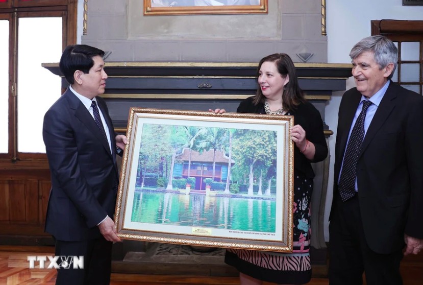 | Chủ tịch nước Lương Cường trao bức tranh Nhà sàn Bác Hồ tặng Chủ tịch Đảng Xã hội Chile Paulina Vodanovic. (Ảnh: Lâm Khánh/TTXVN) |
