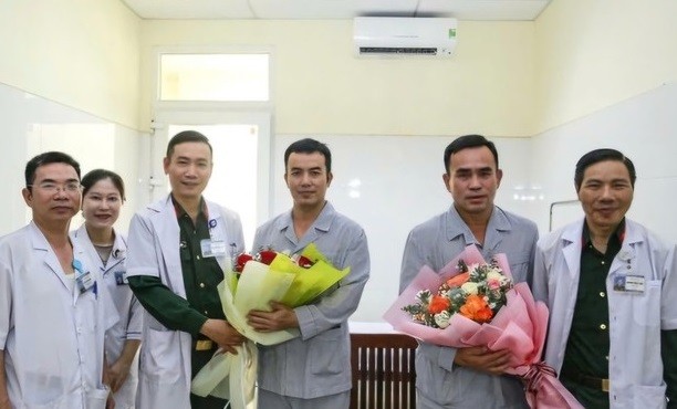 | Bệnh viện Quân y 13 tặng hoa chúc mừng hai phi công được ra viện. Ảnh: A.P |