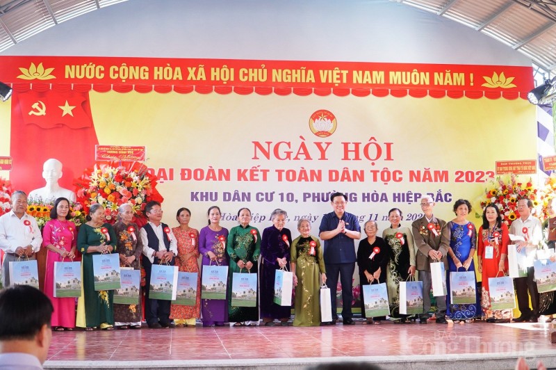 | Chủ tịch Quốc hội Vương Đình Huệ tặng hoa chúc mừng Ngày hội Đại đoàn kết toàn dân tộc Khu dân cư số 10 |