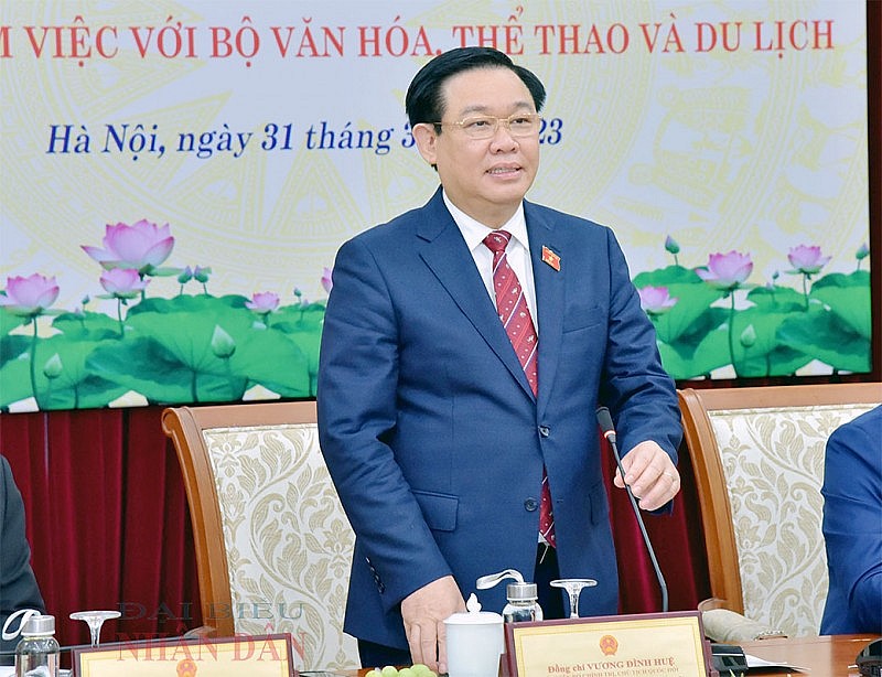 Ngày 31/3, Chủ tịch Quốc hội Vương Đình Huệ đã làm việc với Bộ Văn hoá, Thể thao và Du lịch về việc nghiên cứu, đề xuất bổ sung các nhiệm vụ lập pháp nhằm đáp ứng yêu cầu hoàn thiện đồng bộ thể chế trong lĩnh vực văn hóa để triển khai thực hiện Nghị quyết Đại hội XIII của Đảng, Kết luận của Tổng Bí thư Nguyễn Phú Trọng tại Hội nghị Văn hóa toàn quốc năm 2021, các nghị quyết, kết luận của Ban Chấp hành Trung ương, Bộ Chính trị, Ban Bí thư, kết quả Hội thảo Văn hóa năm 2022 với chủ đề “Thể chế, chính sách và nguồn lực cho phát triển văn hóa” và công tác phối hợp chuẩn bị các nội dung được phân công tổ chức Hội nghị Nghị sĩ trẻ toàn cầu lần thứ 9.