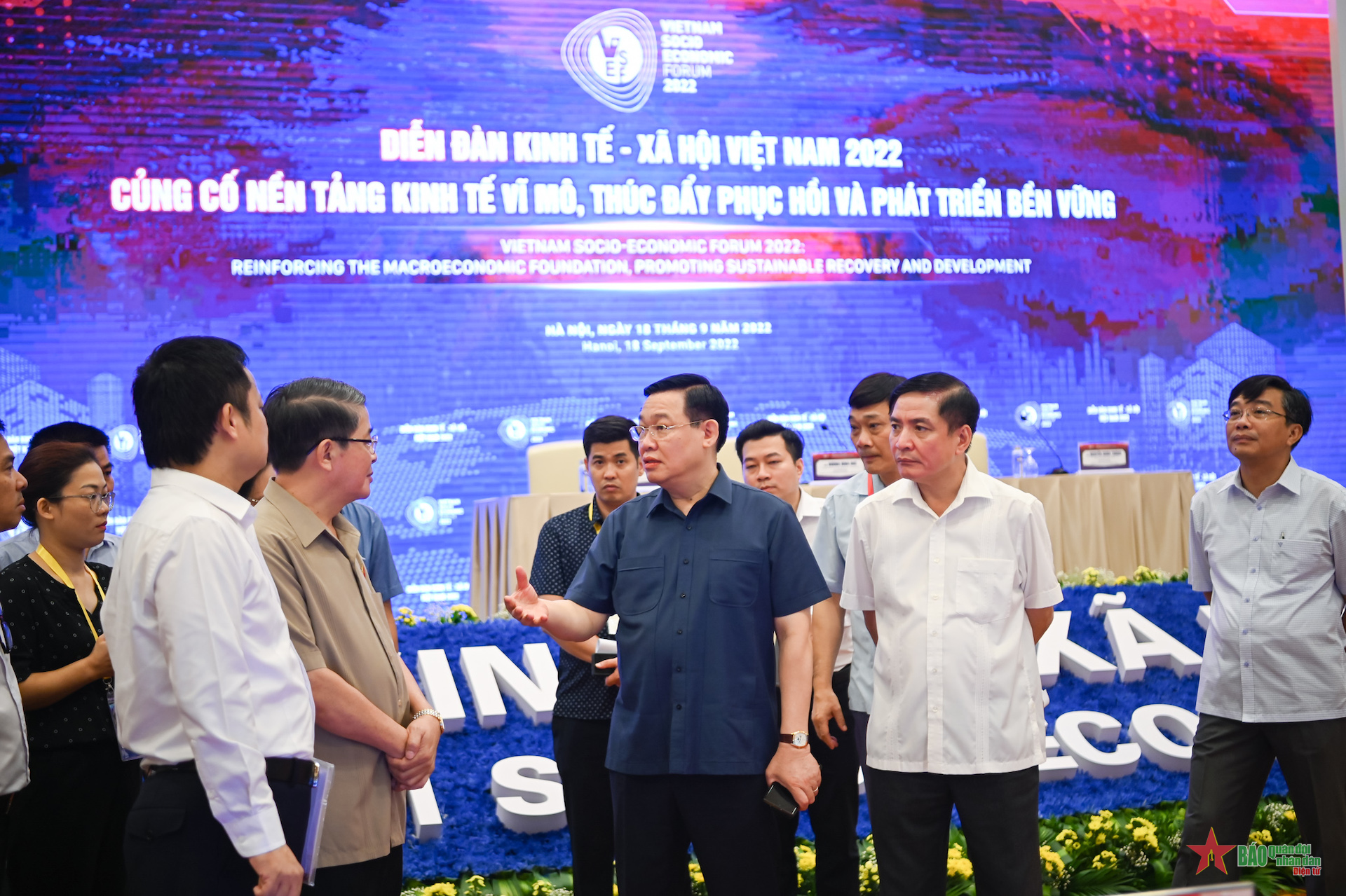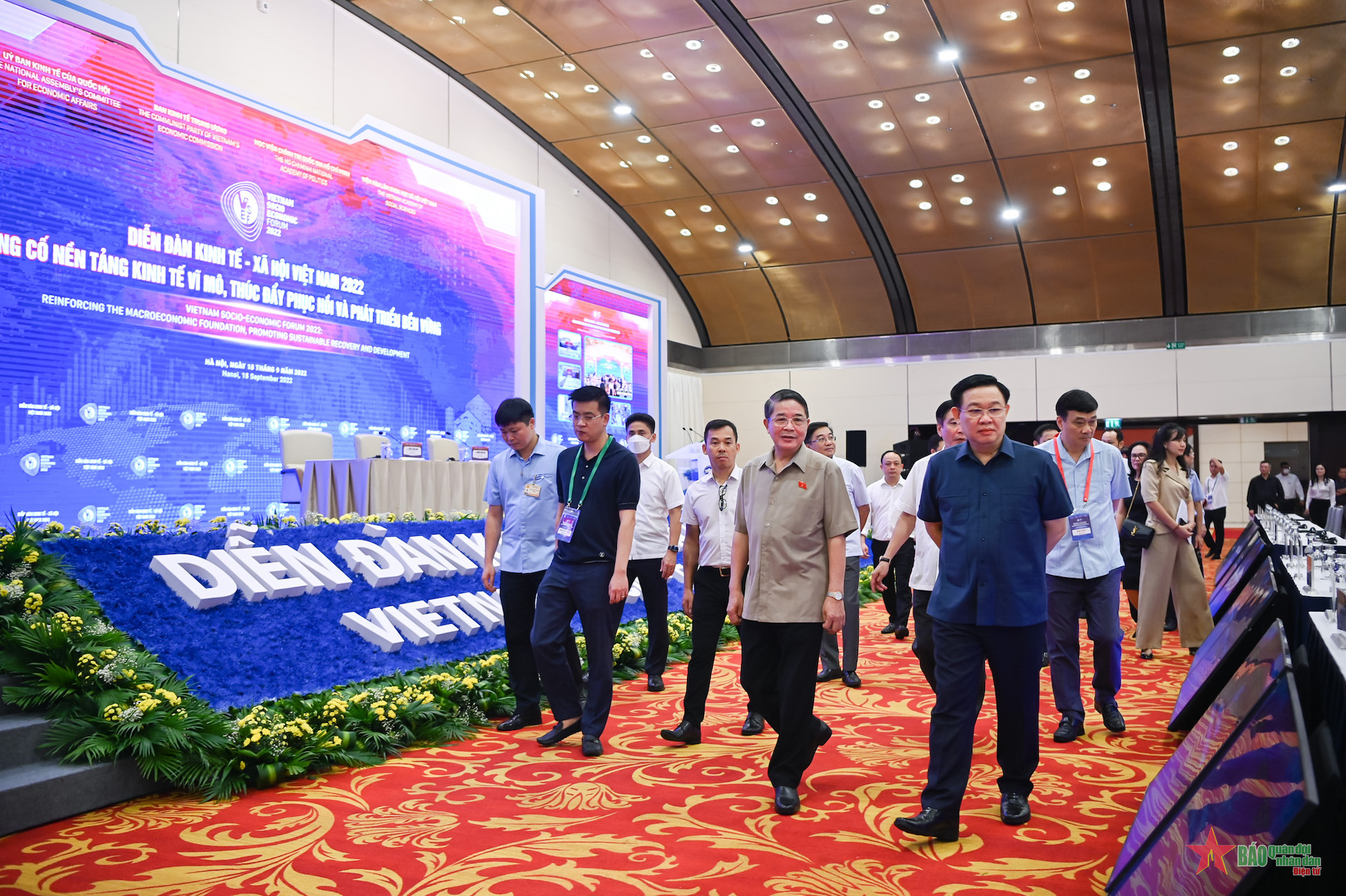 Qua kiểm tra trực tiếp, Chủ tịch Quốc hội Vương Đình Huệ đánh giá công tác chuẩn bị tổ chức Diễn đàn đã được tiến hành chu đáo, chặt chẽ. Chủ tịch Quốc hội nhắc lại bài học kinh nghiệm quý giá giúp nước ta vượt qua những khó khăn, thách thức, nhất là trong hơn 2 năm đại dịch Covid-19 vừa qua và trong giai đoạn phục hồi hiện nay chính là “dĩ bất biến ứng vạn biến”, trong đó, củng cố và giữ vững sự ổn định kinh tế vĩ mô chính là yếu tố nền tảng - “bất biến” để giúp nền kinh tế, giúp đất nước vượt qua mọi “vạn biến” - những diễn biến khó đoán định của tình hình khu vực và quốc tế hiện nay.