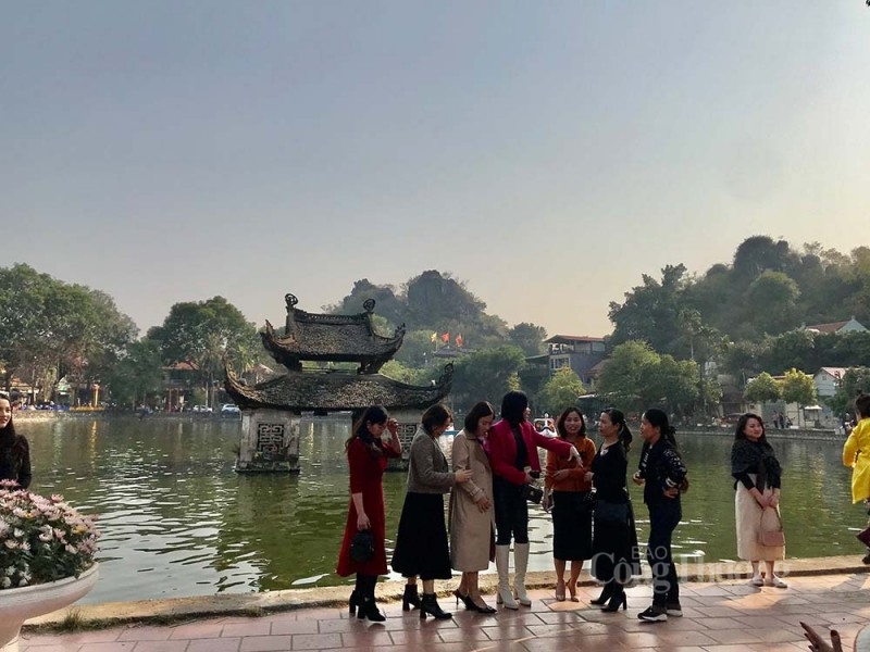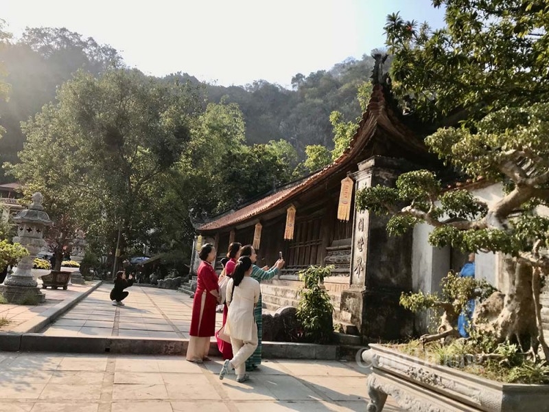 | Du khách háo hức chụp ảnh kỷ niệm tham quan chùa Thầy |