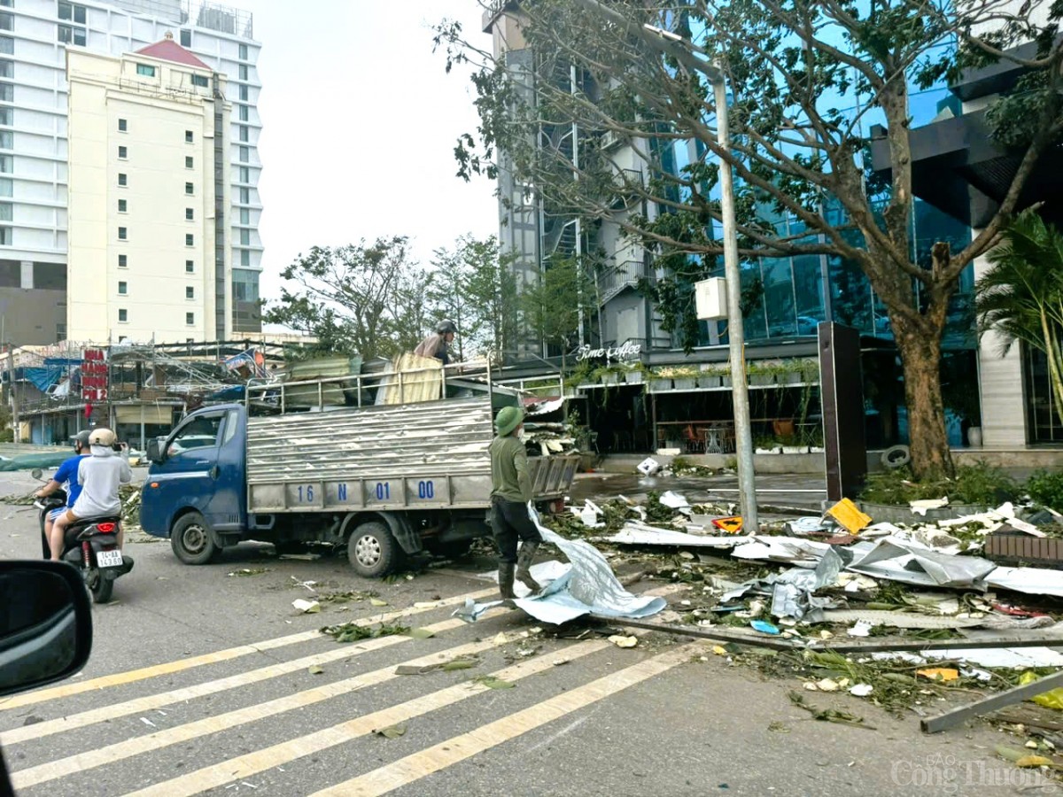 | Người dân địa phương cho biết, sức gió trong bão quá lớn khiến nhiều mái tôn, cửa kính bị thổi bay và rơi xuống đường rất nguy hiểm |