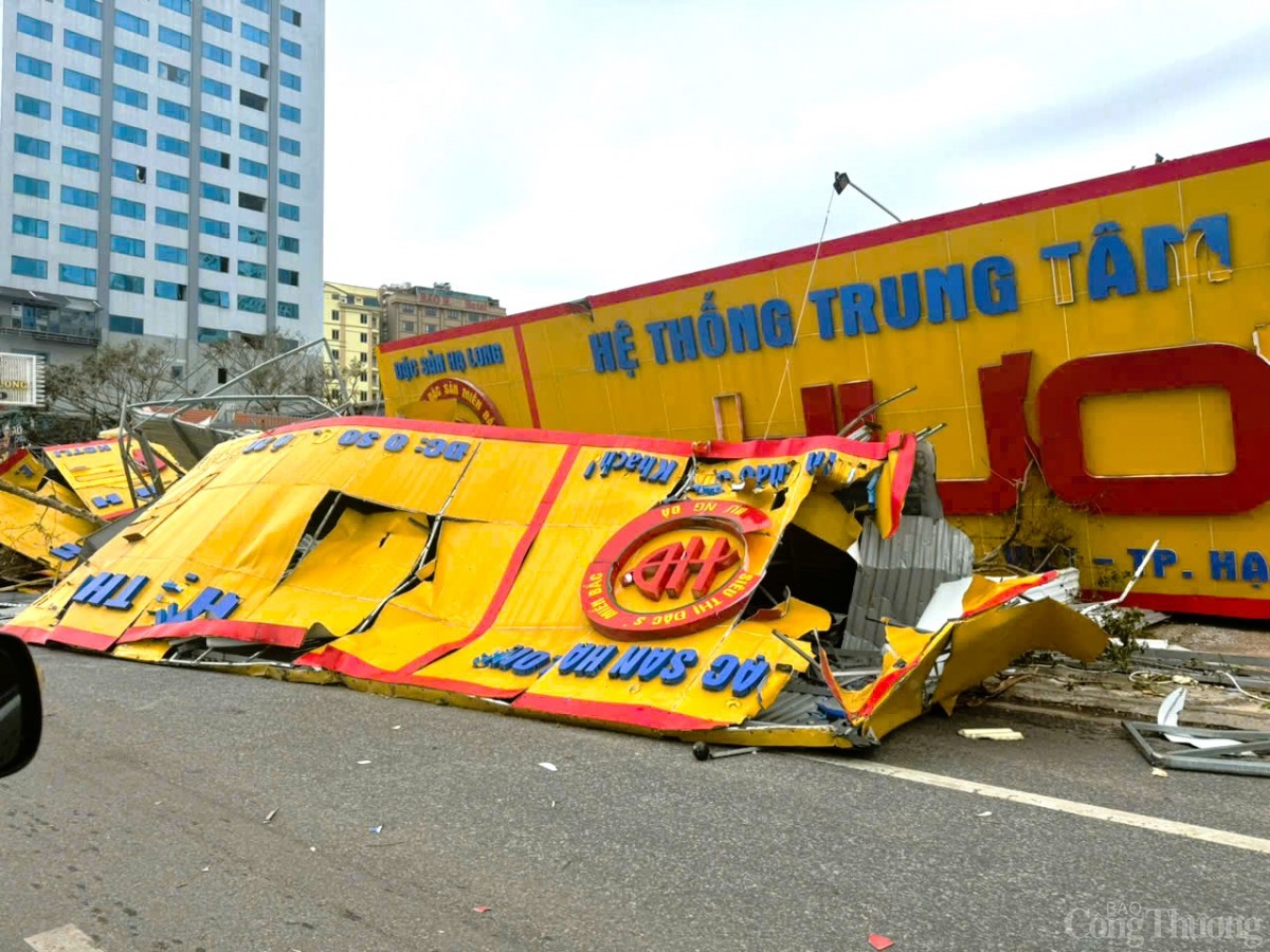 | Hàng trăm bảng hiệu, mái tôn, mái ngói, biển báo của nhà dân, cửa hàng, doanh nghiệp bị thổi bay... |