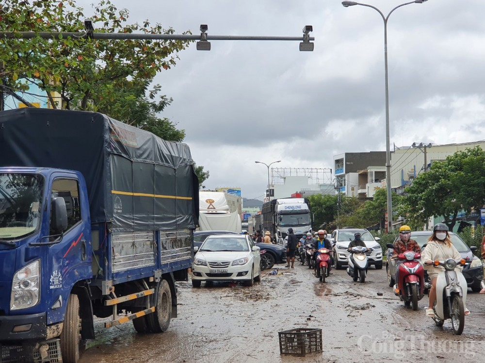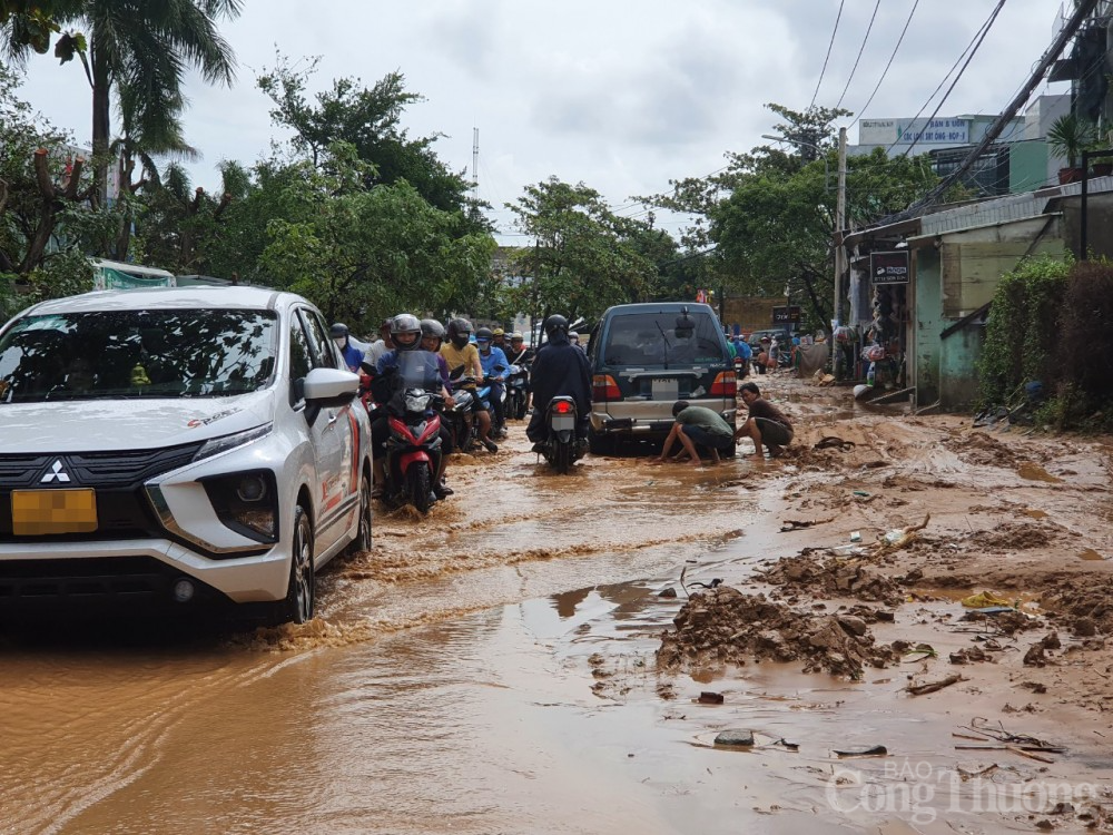 | Tại một số tuyến đường trên địa bàn quận Liên Chiểu, bùn lầy do lũ cuốn gây tắc đường, khó khăn cho người dân trong di chuyển, tham gia giao thông. (Trong ảnh: đường Âu Cơ, quận Liên Chiểu). |