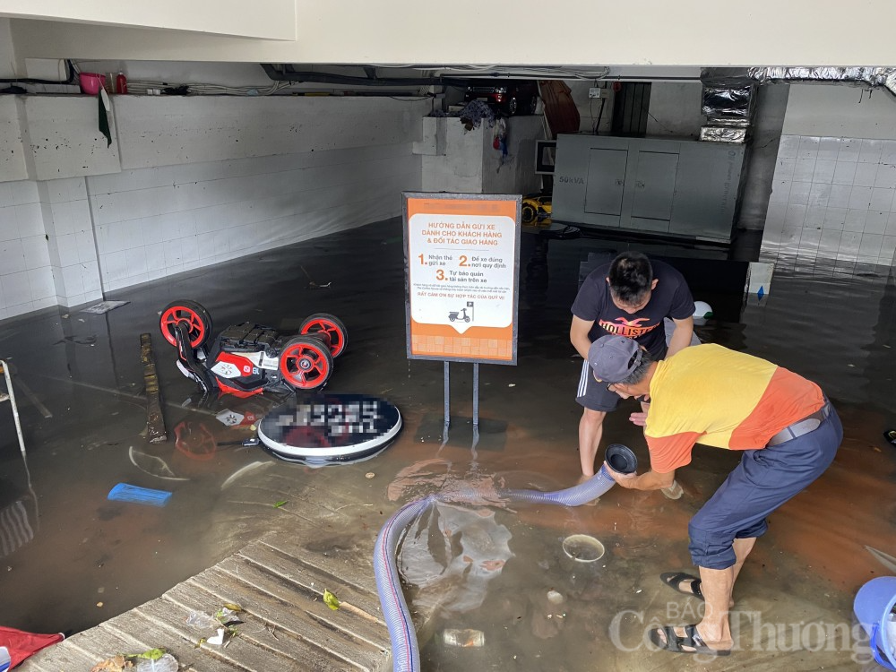 | Tại một số khu chung cư, khu vực hầm để xe vẫn đang ngập cao gây ảnh hưởng tới đời sống dân cư. Qua ghi nhận của phóng viên tại một số khu chung cư trên địa bàn thành phố, người dân đang ra sức hút nước từ khu vực hầm để xe. (Trong ảnh: Hầm để xe của một khu chung cư trên đường Trần Hưng Đạo, quận Sơn Trà) |