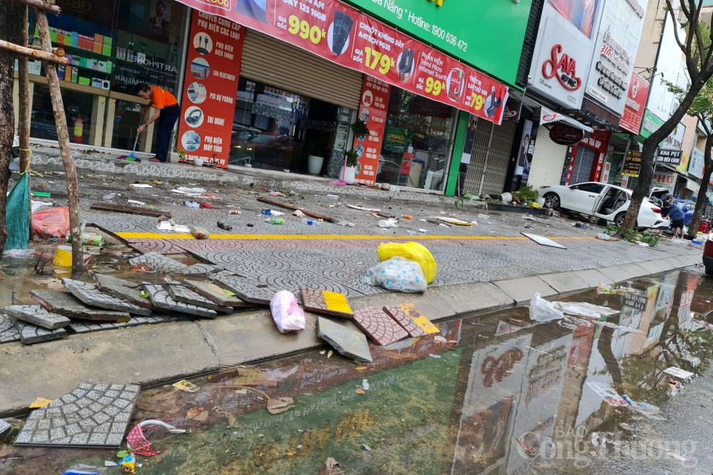 | Tại tuyến đường Hàm Nghi, mưa lớn và ngập lụt đã gây hư hỏng một số lượng lớn gạch lát vỉa hè, cuốn trôi nhiều chậu cây, vật dụng của người dân và làm hư hỏng một số phương tiện giao thông. |