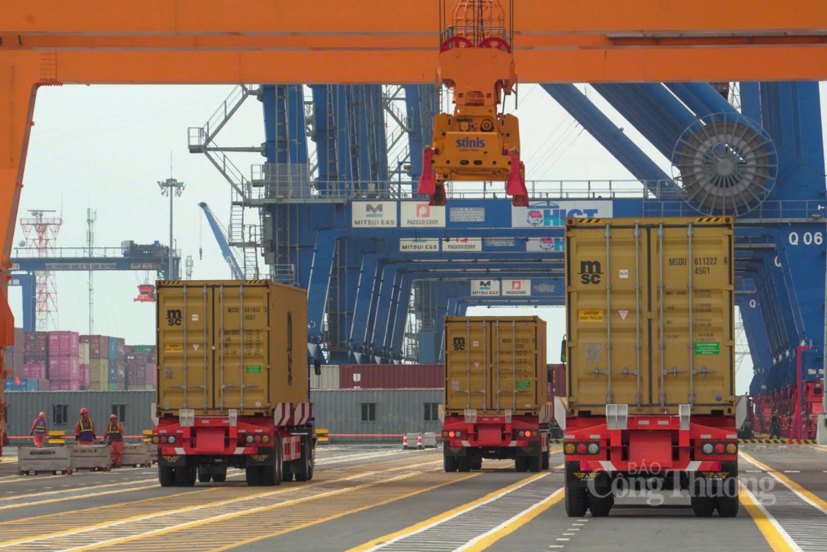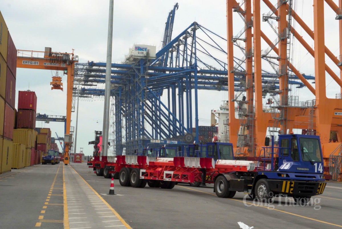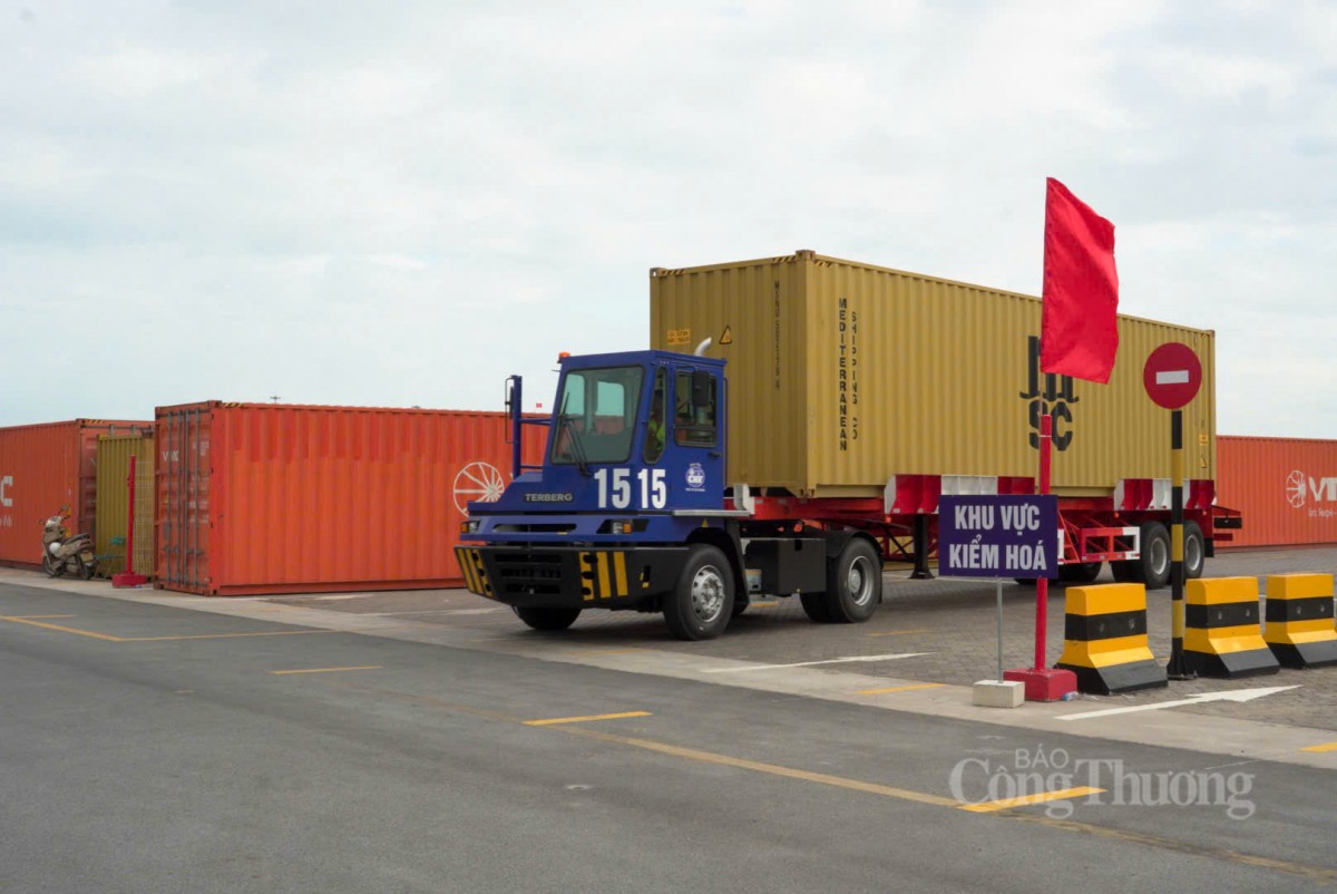 | Xe đầu kéo vận chuyển container vào khu vực kiểm hóa tại bến cảng |