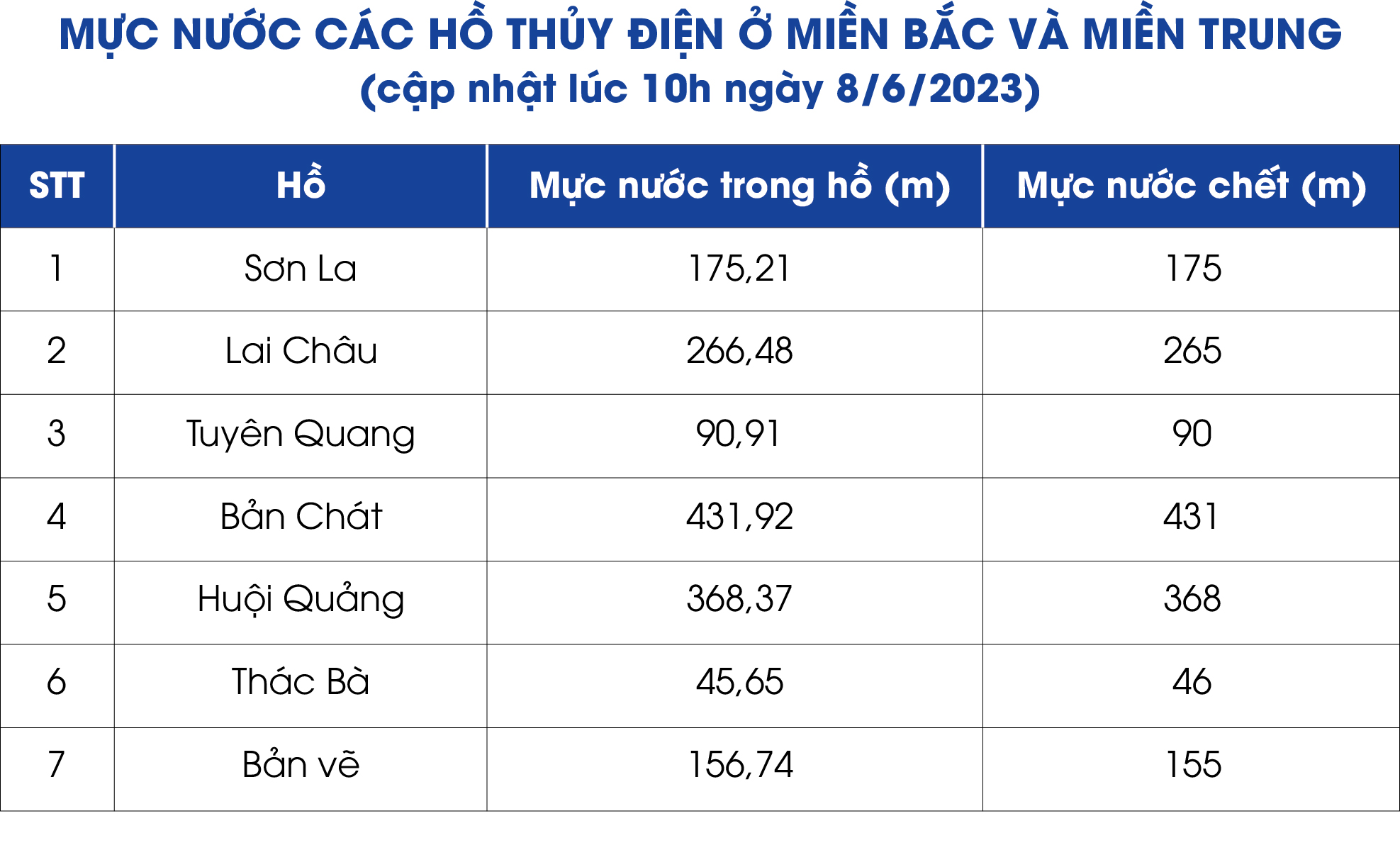 | Nhà máy Thủy điện Huội Quảng (công suất 520MW) cũng đã tiệm cậm mực nước chết (368m). Mức nước tại thời điểm sáng 8/6/2023 là 368,37m. |