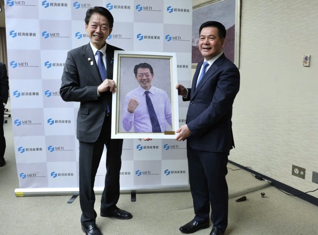 Bộ trưởng Bộ Công Thương Nguyễn Hồng Diên tặng Bộ trưởng Bộ Kinh tế, Thương mại và Công nghiệp Nhật Bản Muto Yoji bức tranh làm từ hạt gạo.