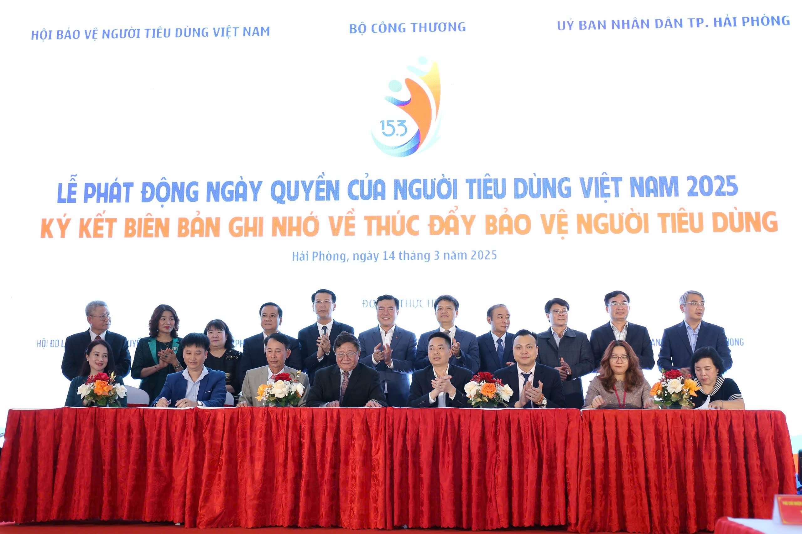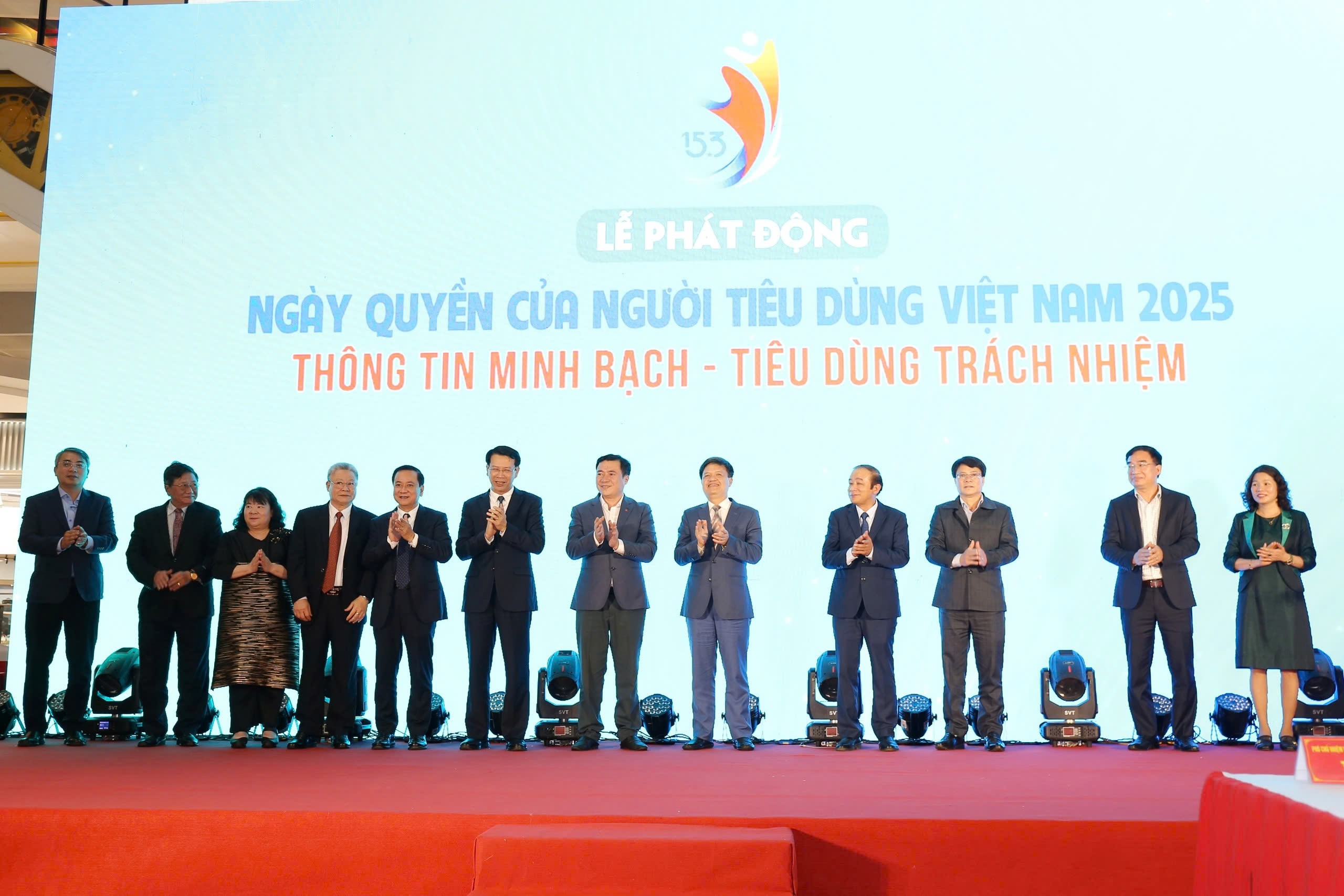 | Các đại biểu thực hiện nghi thức phát động Ngày Quyền của người tiêu dùng Việt Nam năm 2025. Ảnh: Hoàng Lan |