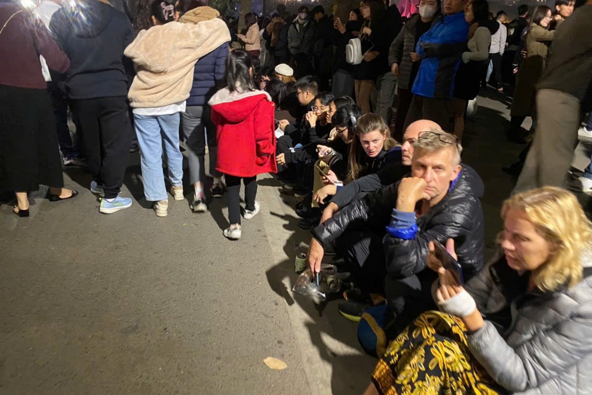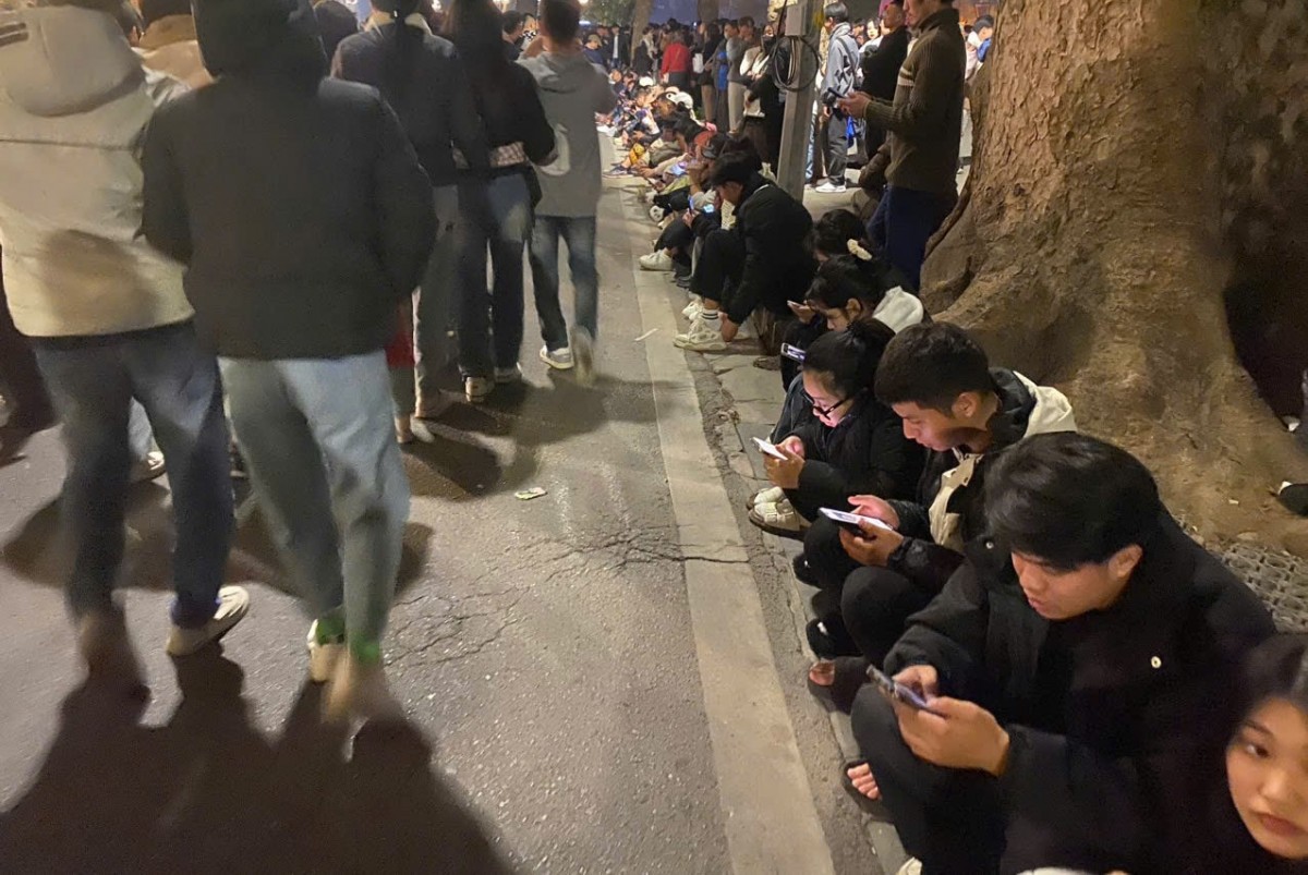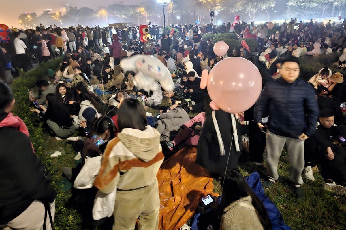 | Bất chấp thời tiết giá lạnh về buổi tối tại Hà Nội, nhiều người ngồi bệt tại ven đường để đón thời khắc chuyển giao giữa năm cũ 2024 và năm mới 2025. Ảnh: Quang Dương |