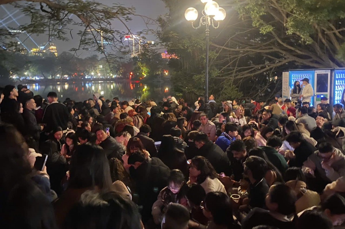 | Hàng nghìn người chen chúc đón thời khắc giao thừa và xem bắn pháo hoa tại khu vực hồ Hoàn Kiếm. Ảnh: Như Ngọc |