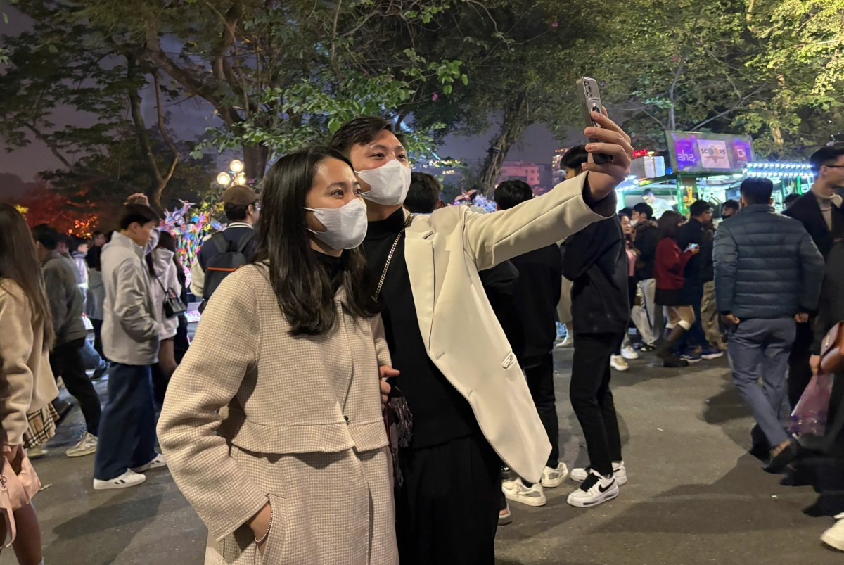| Nhiều bạn trẻ tranh thủ chụp lại khoảnh khắc sôi động, náo nhiệt tại phố đi bộ quanh hồ Hoàn Kiếm. Ảnh: Quang Dương |