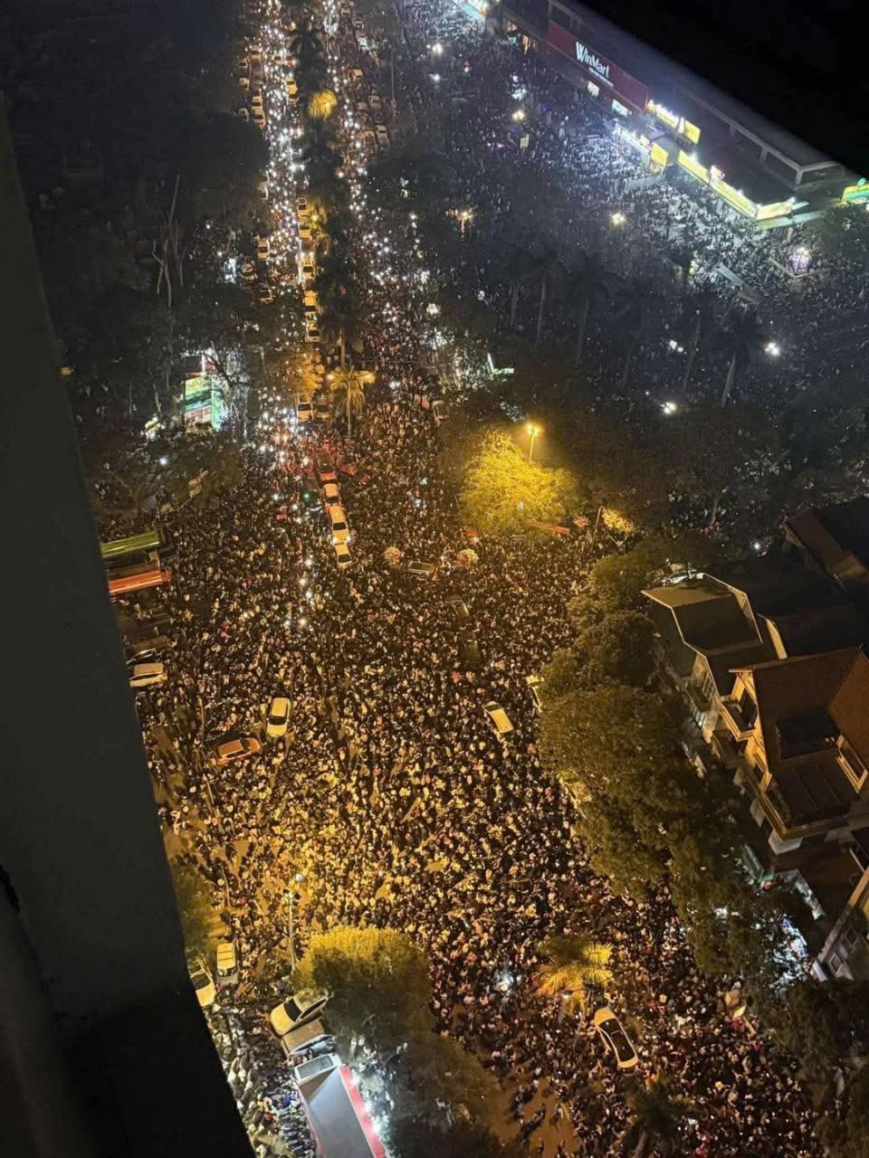 | Hàng nghìn người giữa thời tiết giá lạnh xem bắn pháo hoa tại khu vực sân vận động Mỹ Đình. Ảnh: Việt Anh |