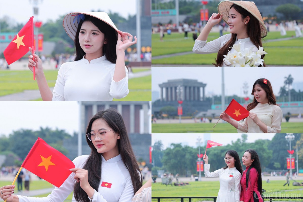 | Những thiếu nữ thướt tha trong tà áo dài, bên khung cảnh thiêng liêng của Quảng trường lịch sử |