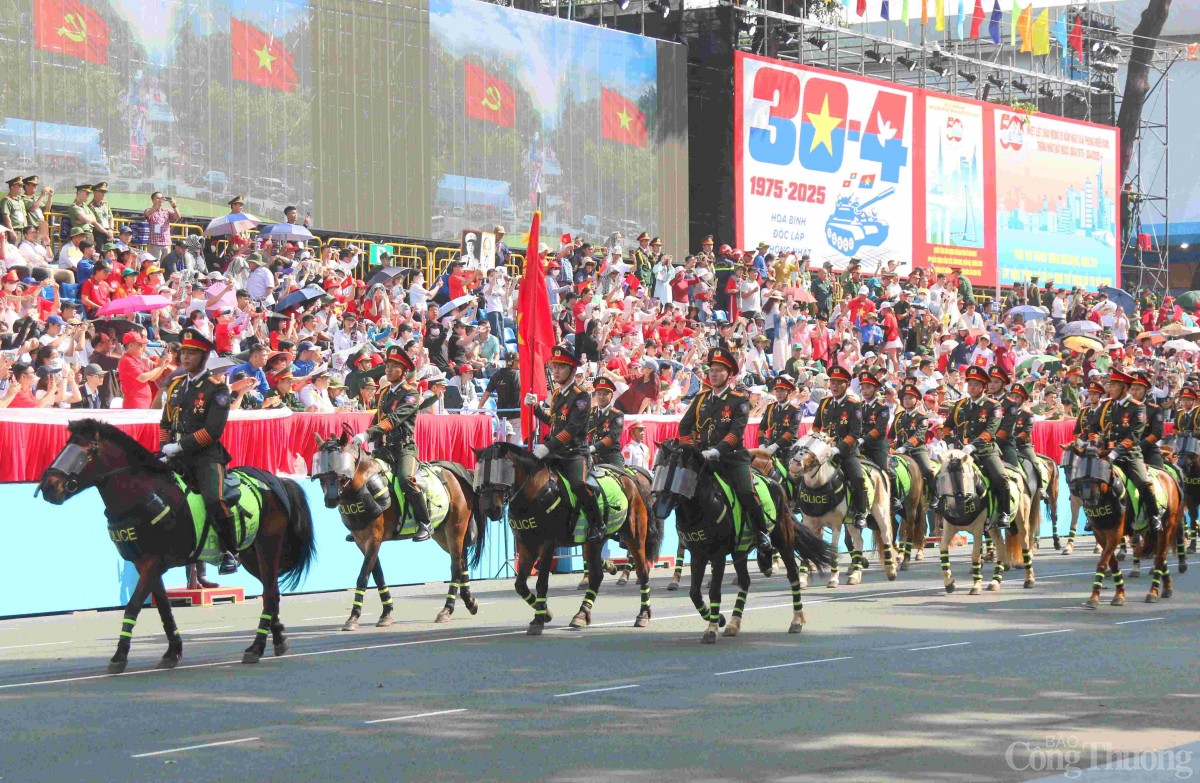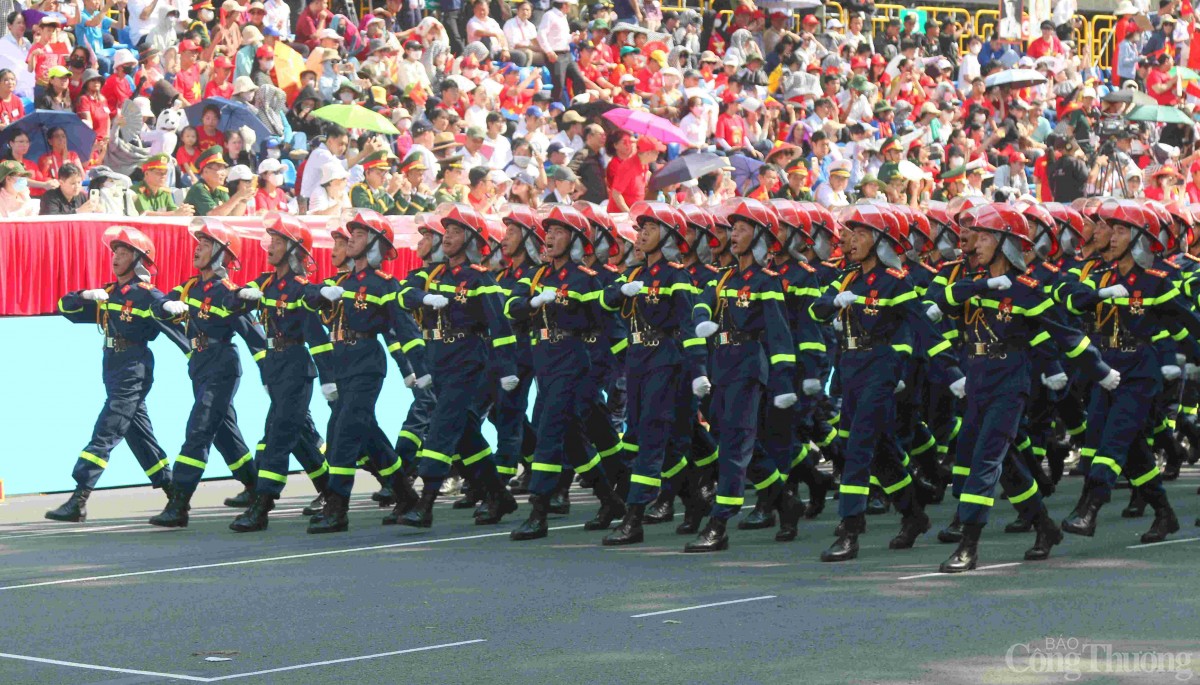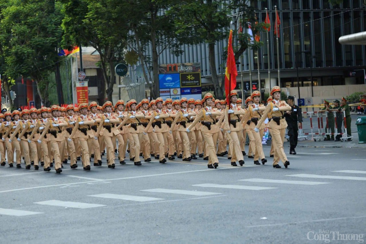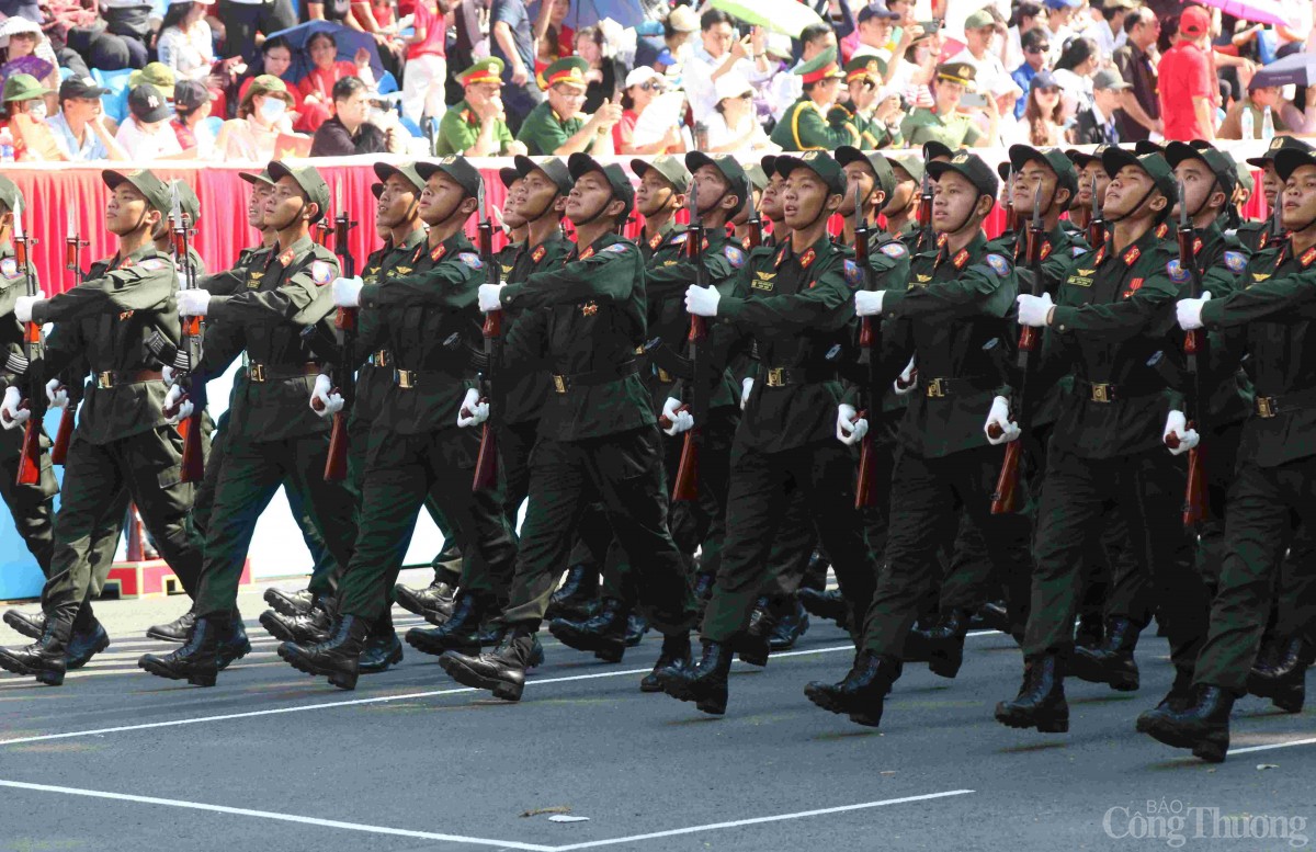 | Khối nam chiến sĩ cảnh sát cơ động mặc quân phục xanh rêu, đội mũ lưỡi trai, mang áo giáp chiến thuật và găng tay trắng, trang bị súng trường AK. |