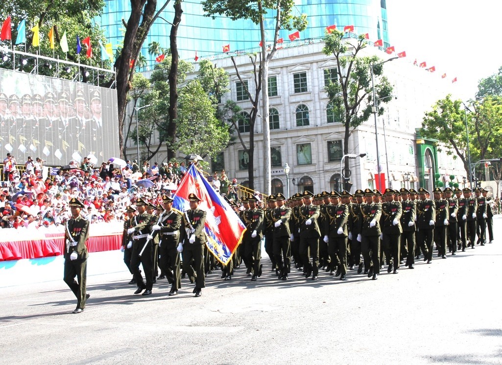 | Quân đội nhân dân Lào được thành lập vào ngày 20/1/1949. Các chiến sĩ mặc quân phục dã chiến xanh đậm, mang găng tay trắng, diễu hành trang nghiêm, đều bước, cầm súng trường AK-47 kiểu hiện đại, thể hiện tinh thần chính quy, kỷ luật và sức mạnh của lực lượng vũ trang nước bạn. |