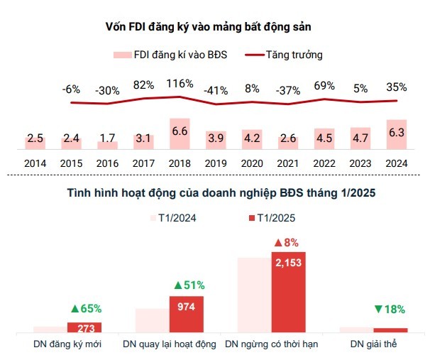 | Tháng 1/2025, hoạt động của doanh nghiệp bất động sản cũng có nhiều khởi sắc. Số lượng doanh nghiệp đăng ký mới đạt 273, tăng 65% so với cùng kỳ năm 2024, số doanh nghiệp quay lại hoạt động lên đến 974, tăng 51%. Những tín hiệu này từ cả phía khách hàng bất động sản lẫn doanh nghiệp thể hiện tâm lý sẵn sàng, cởi mở và động thái tích cực hơn của các bên tham gia thị trường. |