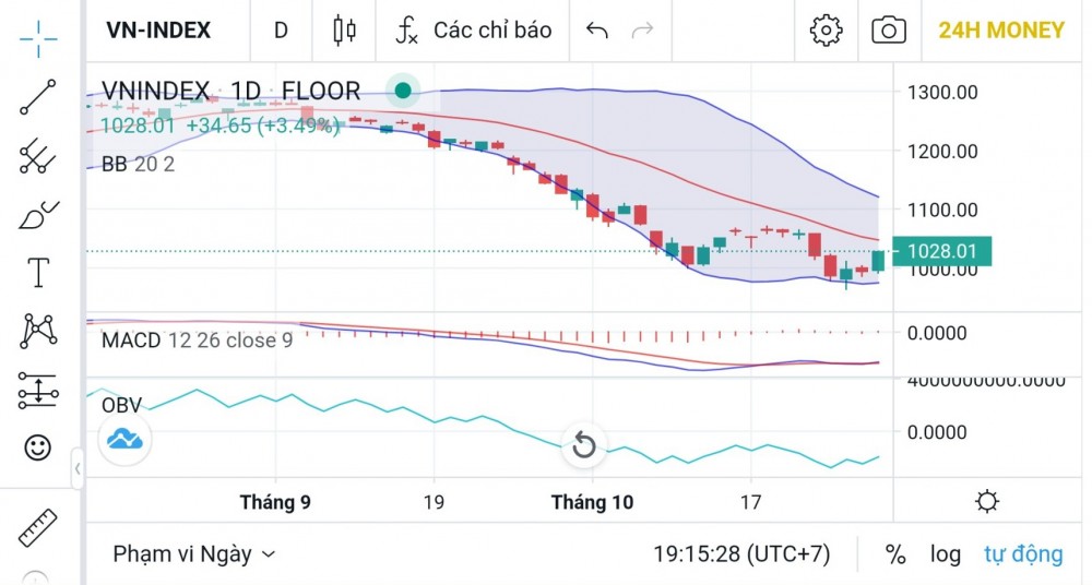 Về kỹ thuật, chỉ số VN-Index đã lấy lại ngưỡng 1.000 điểm. Các chỉ báo kỹ thuật cũng đang dần được cải thiện, ngoài tín hiệu phân kỳ đã xuất hiện ở 2 phiên trước đó, chỉ số Vn-index cũng đã vượt đường trung bình ngắn MA5 và chỉ báo MACD cũng cho tín hiệu đảo chiều đi lên. Thị trường đang hướng đến tuần tăng thứ 2 trong 3 tuần, thêm 1 phiên tăng và thanh khoản khớp lệnh trên 10.000 tỷ đồng có thể lôi kéo dòng tiền đứng ngoài quay trở lại khi đa số các cổ phiếu đang có mức giảm rất sâu. Trong phiên giao dịch ngày 28/10 và những phiên tiếp theo, thị trường có thể hướng đến vùng mục tiêu 1.060 – 1.070 điểm.