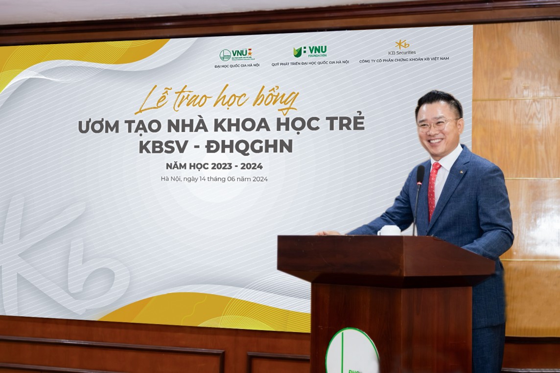 Phát biểu tại buổi lễ, ông Jeon Mun Cheol - Tổng Giám đốc KBSV chia sẻ: “Học bổng “Ươm tạo nhà khoa học trẻ KBSV - ĐHQGHN” được trao năm nay là lần thứ 2, KBSV mong muốn thể hiện tinh thần hợp tác chiến lược giữa 2 bên, đồng thời khẳng định niềm tự hào khi được đồng hành cùng các bạn sinh viên trên hành trình tri thức, khám phá và kiến tạo nên những thành tựu khoa học có tiềm năng ứng dụng cao, góp phần nâng cao giá trị cuộc sống, chung tay tạo nên một thế giới tốt đẹp hơn”.