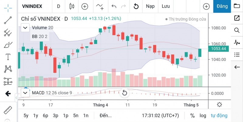 | Trước phiên giao dịch ngày 9/5, chỉ số VN-Index đang đóng cửa ở mốc 1.053,44 điểm |
