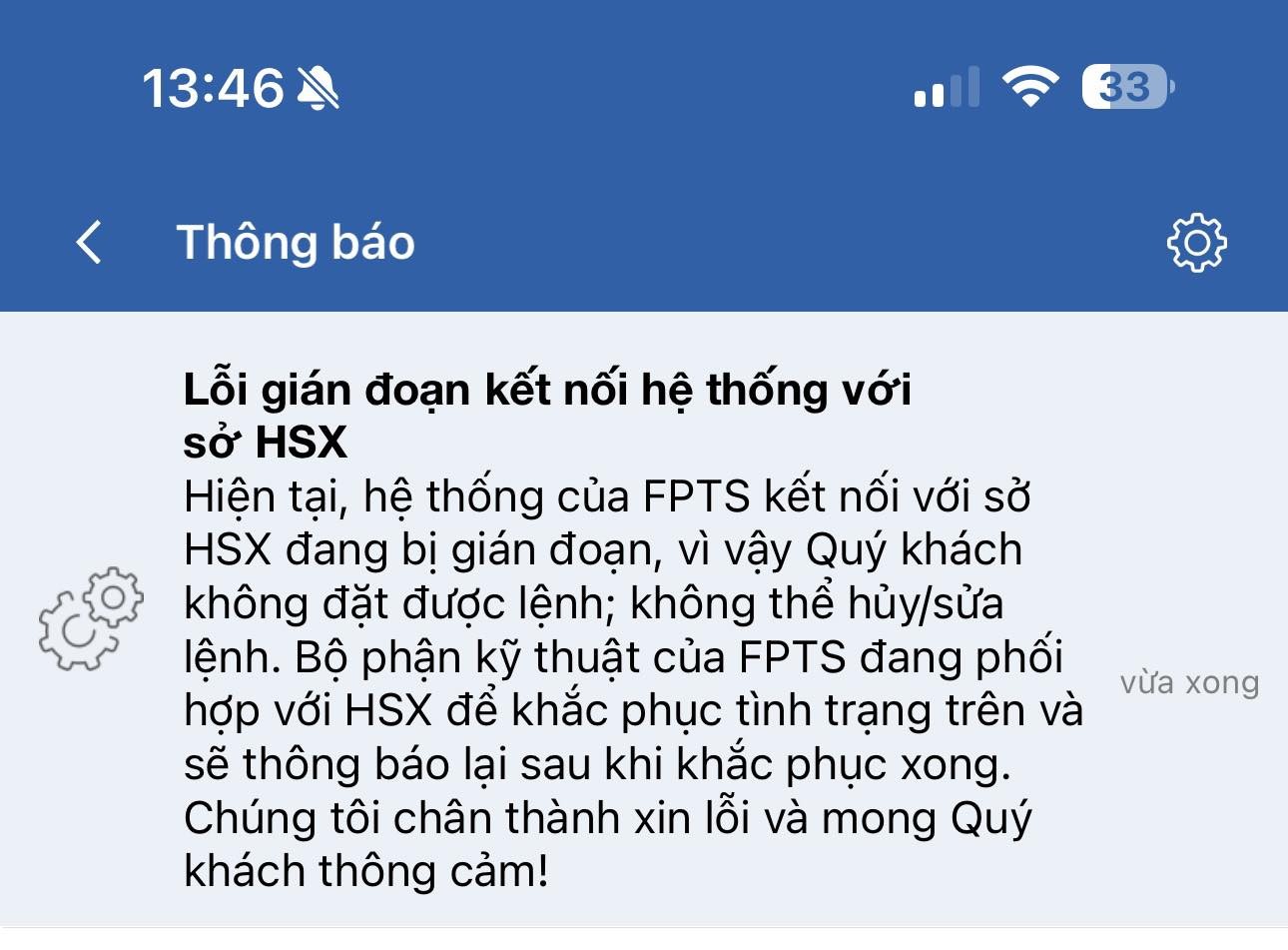 Trong thông báo gửi nhà đầu tư vào 13h46, Công ty chứng khoán FPT (FPTS) cho biết hệ thống kết nối với HoSE bị gián đoạn, khách hàng không đặt được lệnh, hủy hay sửa lệnh. “Bộ phận kỹ thuật của FPTS đang phối hợp với HoSE để khắc phục tình trạng trên”, thông báo cho hay.