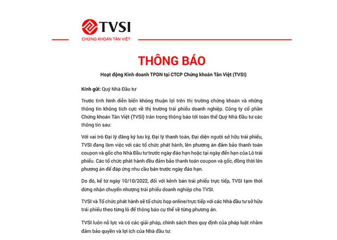 "Do đó, kể từ ngày 10/10/2022, đối với kênh bán trái phiếu trực tiếp, Chứng khoán Tân Việt tạm thời dừng nhận chuyển nhượng trái phiếu doanh nghiệp cho Chứng khoán Tân Việt. Chứng khoán Tân Việt và Tổ chức phát hành sẽ tổ chức họp online/trực tiếp với các nhà đầu tư sở hữu trái phiếu theo từng lô để thông báo cụ thể về từng phương án", thông báo của doanh nghiệp này thể hiện rõ.