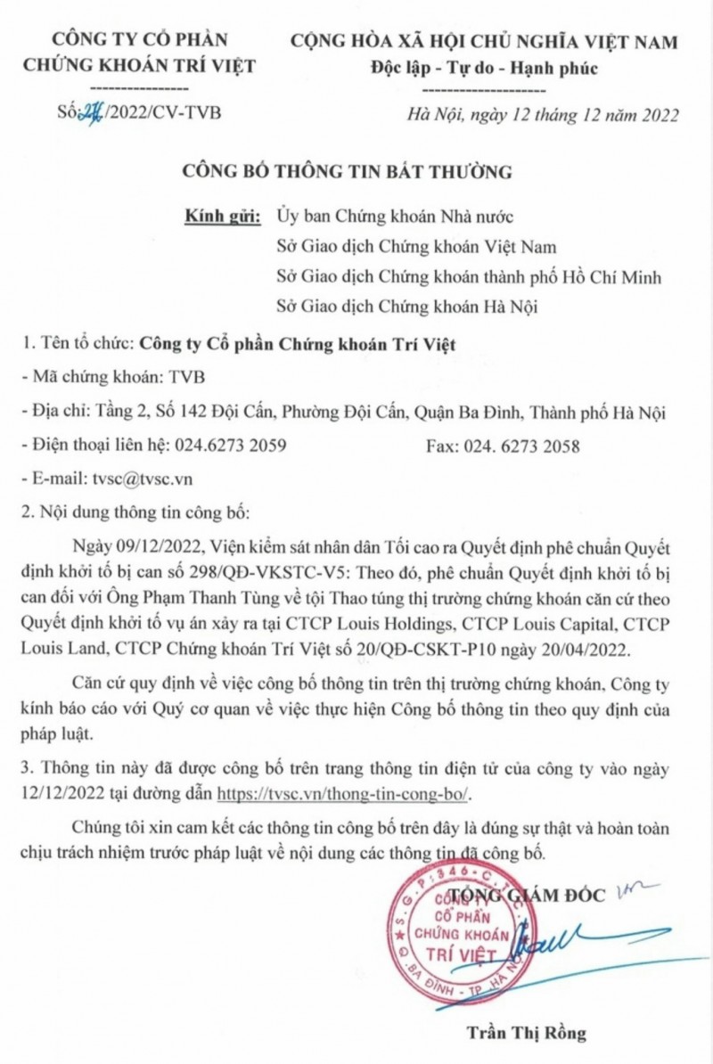 Ngày 12/12, Công ty cổ phần Chứng khoán Trí Việt (HoSE: TVB) đã có văn bản số 276/2022/CV-TVB về việc Công bố thông tin bất thường gửi Ủy ban Chứng khoán Nhà nước. Theo văn bản này, ngày 9/12/2022, Viện kiểm sát nhân dân tối cao đã ra Quyết định phê chuẩn Quyết định khởi tố bị can số 298/QĐ-VKSTC-V5.