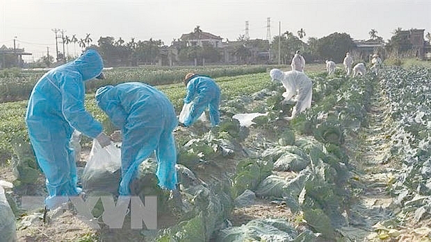 | Hội phụ nữ phường Hiến Thành thu hoạch và bán bắp cải giúp các gia đình đang bị cách ly, phong tỏa. (Ảnh: Mạnh Minh/TTXVN) |