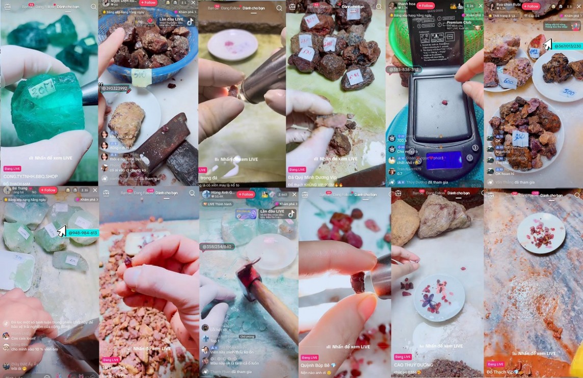 | Nở rộ hoạt động livestream đập đá tìm ngọc trên mạng xã hội TikTok (Ảnh: chụp lại màn hình tại nhiều shop tổ chức các phiên livestream) |